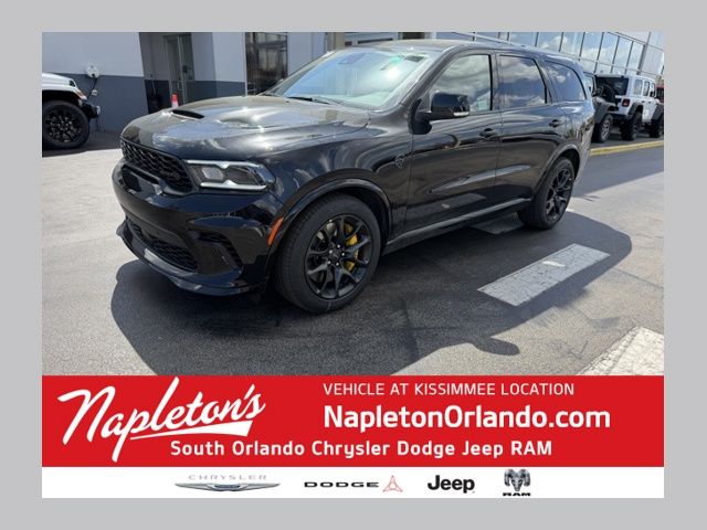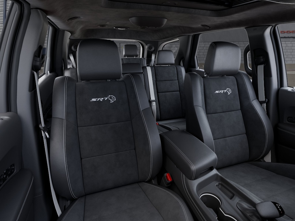 This Durango is well equipped with 3rd Row Seating Group (3rd Row Remote Headrest Dumping, 3rd Row Seat, and 7-Passenger Seating), Gray Metallic Badges (Gloss Black Badges and Satin Black Dodge Tail Lamp Badge), Premium Group (19 Harman/Kardon Amplified Speakers with Subwoofer, 825 Watt Amplifier, Adaptive Cruise Control with Stop, Advanced Brake Assist, Auto High Beam Headlamp Control, Full Speed Forward Collision Warning Plus, Lane Departure Warning Plus, Premium Door Trim Panel, Premium Instrument Panel, and Supercharged Sill Plate), Quick Order Package 2XM Jailbreak (Forged Carbon Fiber Interior Accents and Jailbreak Badge), #6 Seat Foam Cushion, 3.70 Rear Axle Ratio, 4-Wheel Disc Brakes, 9 Speakers, ABS brakes, Adaptive suspension, Air Conditioning, Alloy wheels, AM/FM radio: SiriusXM w/360L, Apple CarPlay/Android Auto, Audio memory, Auto-dimming door mirrors, Auto-dimming Rear-View mirror, Automatic temperature control, Black Alcantara Seats, Brake assist, Bumpers: body-color, Compass, Delay-off headlights, Driver door bin, Driver vanity mirror, Dual front impact airbags, Dual front side impact airbags, Eclipse Black Exhaust Tips, Electronic Stability Control, Emergency communication system: Dodge Connect, Four wheel independent suspension, Front anti-roll bar, Front Bucket Seats, Front Center Armrest w/Storage, Front dual zone A/C, Front reading lights, Fully automatic headlights, Garage door transmitter, Hammerhead Gray Seat Belts, Heated door mirrors, Heated front seats, Heated rear seats, Heated steering wheel, Illuminated entry, Knee airbag, Leather Shift Knob, Leather steering wheel, Leather Trimmed Bucket Seats, Leather/Suede Wrapped Steering Wheel, Low tire pressure warning, Memory seat, MyFlexCare Service Plan, Navigation System, Occupant sensing airbag, Outside temperature display, Overhead airbag, Overhead console, Panic alarm, ParkView Rear Back-Up Camera, Passenger door bin, Passenger vanity mirror, Power door mirrors, Power driver seat, Power Liftgate, Power passenger seat, Power steering, Power Sunroof, Power windows, Radio data system, Radio: Uconnect 5 Nav with 10.1" Display, Rain sensing wipers, Rear air conditioning, Rear anti-roll bar, Rear reading lights, Rear seat center armrest, Rear window defroster, Rear window wiper, Remote keyless entry, Security system, Speed control, Speed-sensing steering, Speed-Sensitive Wipers, Split folding rear seat, Spoiler, Sport steering wheel, Steering wheel mounted audio controls, Suede Headliner, Tachometer, Telescoping steering wheel, Tilt steering wheel, Traction control, Trip computer, Turn signal indicator mirrors, Variably intermittent wipers, Ventilated front seats, Voltmeter, Wheels: 20" x 10" Lights Out Aluminum, Wheels: 20" x 10" Machine Face with Dark Pockets, and Yellow Brake Calipers. Not all customers qualify for all rebates. See dealer for details. Price includes: $500 - 2026 National 2026 Military Bonus Cash . Exp. 01/04/2027