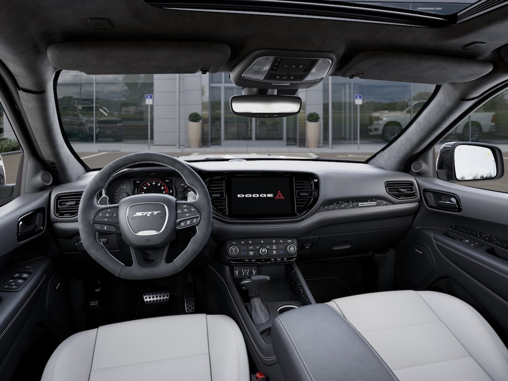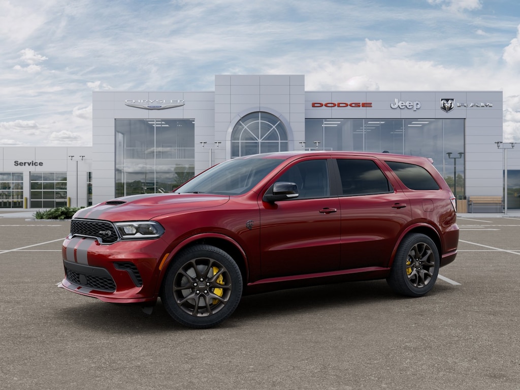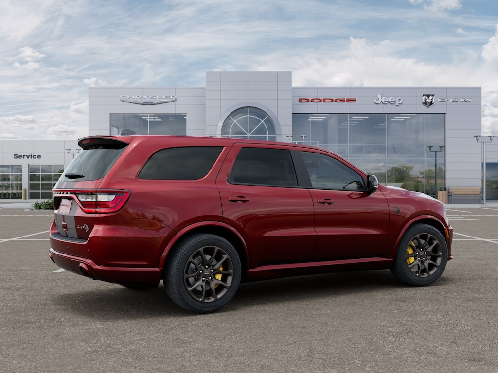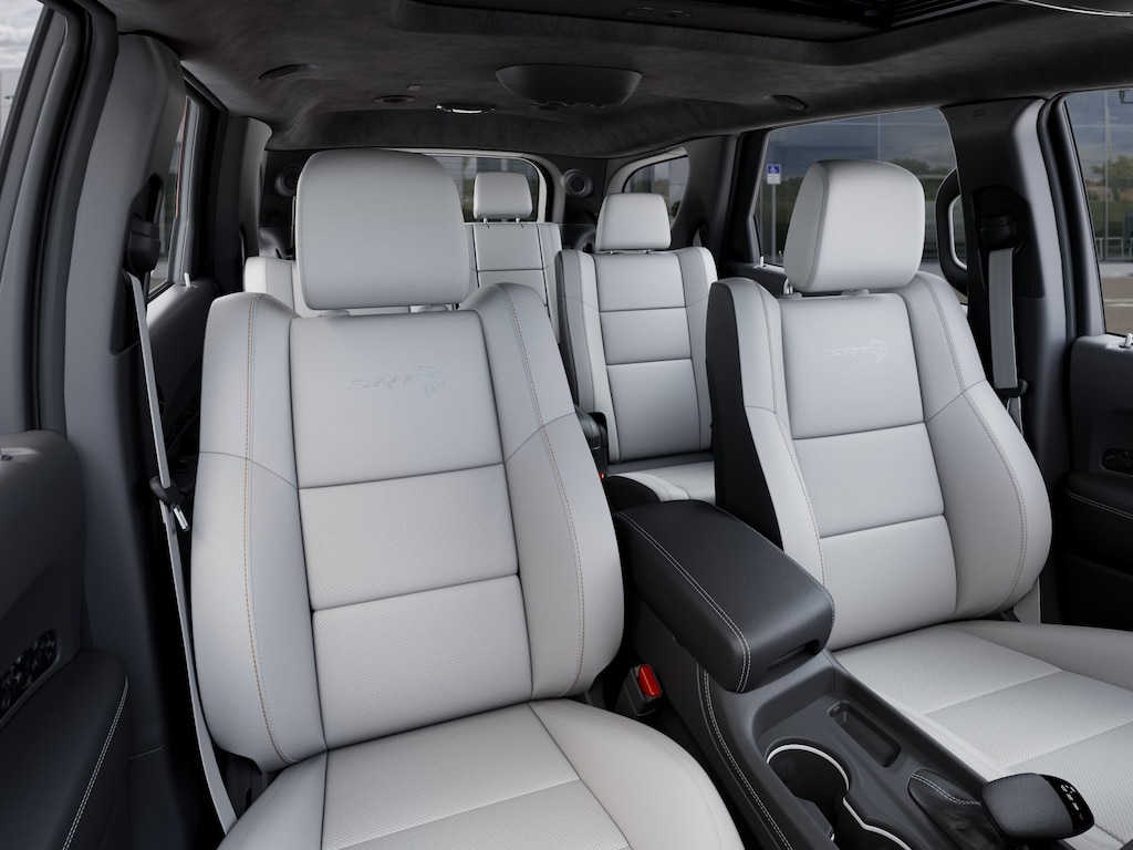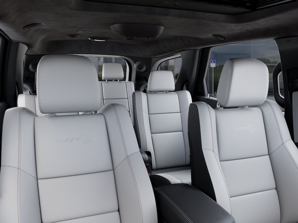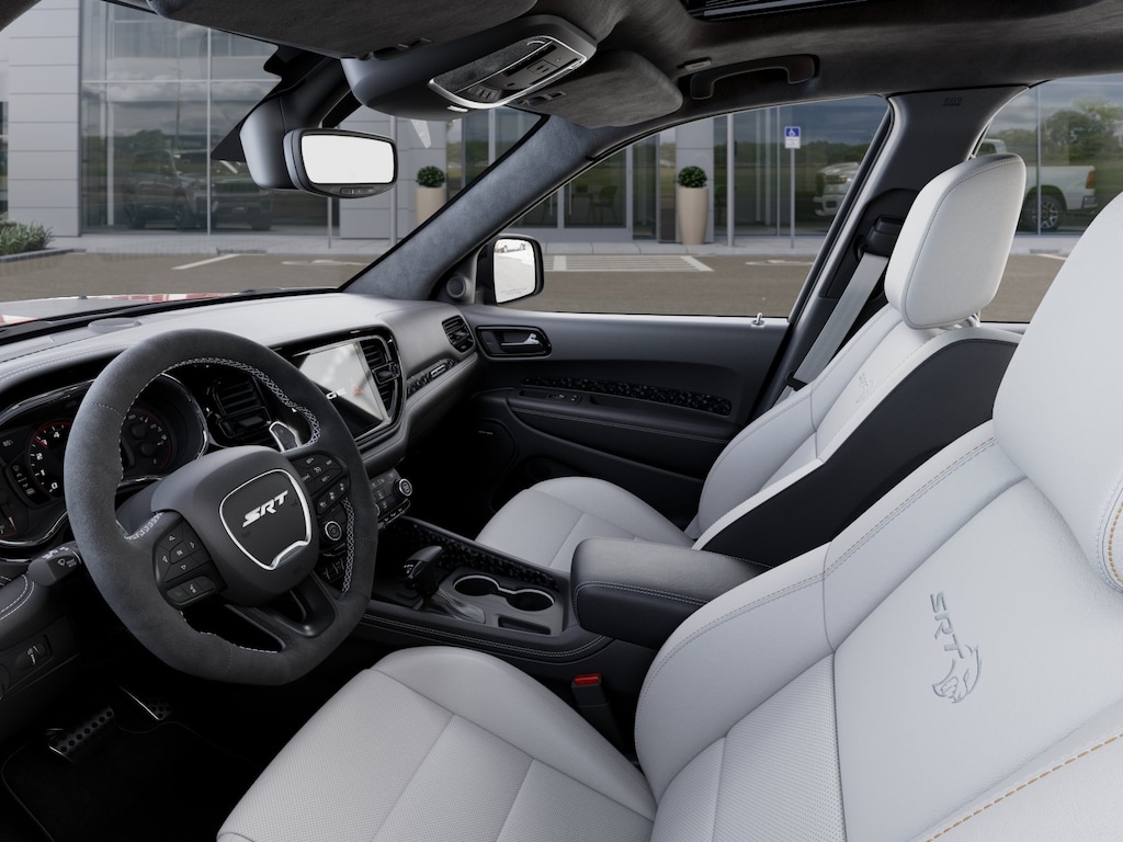 This Durango is well equipped with Gray Metallic Badges (Gloss Black Badges and Satin Black Dodge Tail Lamp Badge), Premium Group (19 Harman/Kardon Amplified Speakers with Subwoofer, 825 Watt Amplifier, Adaptive Cruise Control with Stop, Advanced Brake Assist, Auto High Beam Headlamp Control, Full Speed Forward Collision Warning Plus, Lane Departure Warning Plus, Premium Door Trim Panel, Premium Instrument Panel, and Supercharged Sill Plate), Quick Order Package 2XM Jailbreak (Forged Carbon Fiber Interior Accents and Jailbreak Badge), 2nd Row Fold/Tumble Captain Chairs, 3.70 Rear Axle Ratio, 4-Wheel Disc Brakes, 9 Speakers, ABS brakes, Adaptive suspension, Air Conditioning, Alloy wheels, AM/FM radio: SiriusXM w/360L, Apple CarPlay/Android Auto, Audio memory, Auto-dimming door mirrors, Auto-dimming Rear-View mirror, Automatic temperature control, Brake assist, Bumpers: body-color, Compass, Delay-off headlights, Driver door bin, Driver vanity mirror, Dual front impact airbags, Dual front side impact airbags, Eclipse Black Exhaust Tips, Electronic Stability Control, Emergency communication system: Dodge Connect, Four wheel independent suspension, Front anti-roll bar, Front Bucket Seats, Front Center Armrest w/Storage, Front dual zone A/C, Front reading lights, Fully automatic headlights, Garage door transmitter, Hammerhead Gray Seat Belts, Heated door mirrors, Heated front seats, Heated rear seats, Heated steering wheel, Illuminated entry, Knee airbag, Leather Shift Knob, Leather steering wheel, Leather Trimmed Bucket Seats, Leather/Suede Wrapped Steering Wheel, Low tire pressure warning, Manufacturer's Statement of Origin, Memory seat, MOPAR Dual Stripes- Gunmetal Low Gloss, MyFlexCare Service Plan, Navigation System, Occupant sensing airbag, Outside temperature display, Overhead airbag, Overhead console, Panic alarm, ParkView Rear Back-Up Camera, Passenger door bin, Passenger vanity mirror, Power door mirrors, Power driver seat, Power Liftgate, Power passenger seat, Power steering, Power Sunroof, Power windows, Radio data system, Radio: Uconnect 5 Nav with 10.1" Display, Rain sensing wipers, Rear air conditioning, Rear anti-roll bar, Rear reading lights, Rear seat center armrest, Rear window defroster, Rear window wiper, Remote keyless entry, Security system, Speed control, Speed-sensing steering, Speed-Sensitive Wipers, Split folding rear seat, Spoiler, Sport steering wheel, Steering wheel mounted audio controls, Suede Headliner, Tachometer, Telescoping steering wheel, Tilt steering wheel, Traction control, Trip computer, Turn signal indicator mirrors, Variably intermittent wipers, Ventilated front seats, Voltmeter, Wheels: 20" x 10" Machine Face with Dark Pockets, Wheels: 20" x 10" SRT Hellcat Brass Monkey, and Yellow Brake Calipers.
