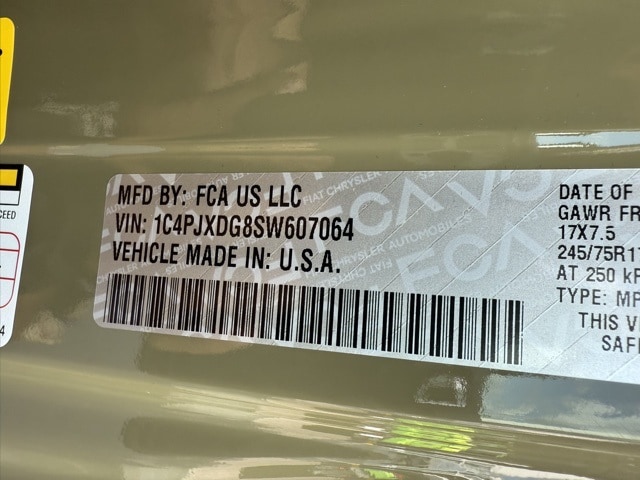 This Wrangler is well equipped with Quick Order Package 24S Sport S (Advanced Brake Assist, Automatic Headlamps, Corning Gorilla Glass, Deep Tint Sunscreen Windows, Enhanced Adaptive Cruise Control, Full Speed Forward Collision Warning Plus, Power Heated Mirrors, Premium Wrapped Steering Wheel, Security Alarm, Sun Visors w/Illuminated Vanity Mirrors, and Wheels: 17" x 7.5" Gray), 110 MPH Vehicle Max Speed Calibration, 3.45 Overall Top Gear Ratio, 4-Wheel Disc Brakes, 8 Speakers, ABS brakes, Air Conditioning, AM/FM radio: SiriusXM, Apple CarPlay/Android Auto, Aux Battery, Brake assist, Cloth Low-Back Bucket Seats, Compass, Delay-off headlights, Driver door bin, Driver vanity mirror, Dual front impact airbags, Dual front side impact airbags, Electronic Stability Control, Front anti-roll bar, Front Bucket Seats, Front Center Armrest w/Storage, Front fog lights, Front reading lights, Illuminated entry, Integrated roll-over protection, Low tire pressure warning, MOPAR All-Weather Floor Mats, Non-Lock Fuel Cap w/o Discriminator, Normal Duty Suspension, Occupant sensing airbag, Outside temperature display, Overhead airbag, Panic alarm, ParkView Rear Back-Up Camera, Passenger door bin, Passenger vanity mirror, Power steering, Power Top Quarter Window Storage Bag, Power windows, Radio data system, Radio: Uconnect 5 w/12.3" Display, Rear anti-roll bar, Rear reading lights, Rear Window Defroster, Rear Window Wiper/Washer, Remote keyless entry, Removable Rear Quarter Windows, Sky 1-Touch Power Top, Speed control, Split folding rear seat, Steering wheel mounted audio controls, Stop-Start Dual Battery System, Tachometer, Telescoping steering wheel, Tilt steering wheel, Traction control, Trip computer, Variably intermittent wipers, and Wheels: 17" x 7.5" Black Steel Styled. Not all customers qualify for all rebates. See dealer for details. Price includes: $2500 - 2025 National Retail Bonus Cash . Exp. 11/03/2025