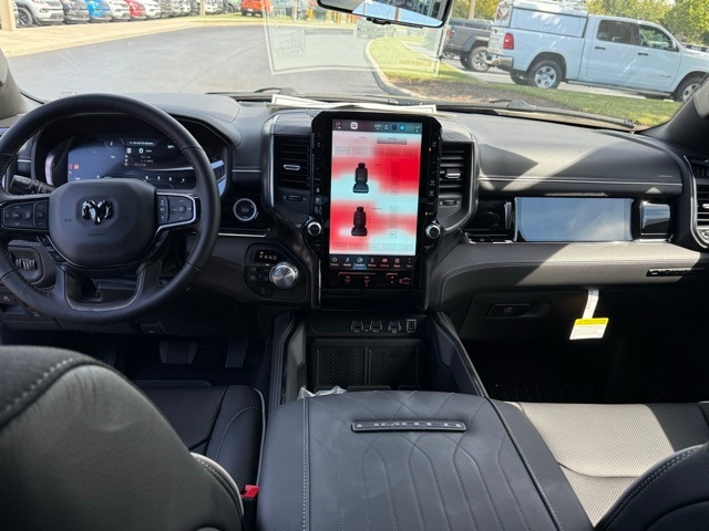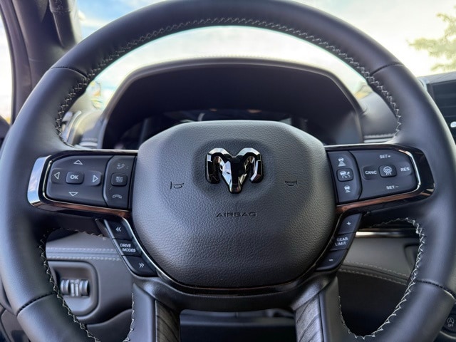 This 1500 is well equipped with Body Color Bumper Group (Body Color Front Bumper and Body Color Rear Bumper w/Step Pads), Limited Level An Equipment Group (12-Way/1-Way Trailer Connector, 14.4" Touchscreen Display, 240 Amp Alternator, 4G LTE Wi-Fi Hot Spot, Apple CarPlay, Connected Travel & Traffic Services, Connectivity - US/Canada, Disassociated Touchscreen Display, Drowsy Driver Detection, Evasive Steer Assist, Exterior 115V AC Outlet, Global Telematics Box Module (TBM), Google Android Auto, GPS Antenna Input, GPS Navigation, Hands-Free Active Driving Assist System, HD Radio, Heads-Up Display, Integrated Center Stack Radio, Integrated Voice Command w/Bluetooth, Intersection Collision Assist System, LED CHMSL Lamp, Radio: Uconnect 5 Nav w/14.4" Display, RamBox Cargo Management System, SiriusXM Radio Service, SiriusXM w/360L, Smartphone As A Key Capable, Surround View Camera System, Traffic Sign Recognition, Tri-Fold Tonneau Cover, and USB Host Flip), Quick Order Package 22M Limited, 19 Speakers, 3.92 Rear Axle Ratio, 4-Wheel Disc Brakes, ABS brakes, Active Noise Control System, Adjustable pedals, Air Conditioning, Alloy wheels, AM/FM radio, Apple CarPlay/Android Auto, Audio memory, Auto High-beam Headlights, Auto Power-Folding Mirrors, Auto-dimming door mirrors, Auto-Dimming Exterior Driver Mirror, Auto-dimming Rear-View mirror, Auto-leveling suspension, Automatic temperature control, Bodyside moldings, Brake assist, Bumpers: chrome, Chrome Exterior Mirrors, Compass, Convex Wide-Angle Exterior Mirror Insert, Delay-off headlights, Dome Dual LED Reading Lamp, Driver door bin, Driver vanity mirror, Dual front impact airbags, Dual front side impact airbags, Dual-Pane Panoramic Sunroof, Electronic Stability Control, Exterior Mirrors Courtesy Lamps, Exterior Mirrors w/Heating Element, Exterior Mirrors w/Memory, Exterior Mirrors w/Supplemental Signals, Exterior Parking Camera Rear, Front anti-roll bar, Front Bucket Seats, Front Center Armrest w/Storage, Front dual zone A/C, Front fog lights, Front reading lights, Front wheel independent suspension, Fully automatic headlights, Garage door transmitter, Genuine wood console insert, Genuine wood dashboard insert, Genuine wood door panel insert, Heated door mirrors, Heated front seats, Heated rear seats, Heated steering wheel, Illuminated entry, Leather steering wheel, LED Dome/Reading Lamp, Low tire pressure warning, Manufacturer's Statement of Origin, Memory seat, MyFlexCare Service Plan, Navigation System, Occupant sensing airbag, Outside temperature display, Overhead airbag, Overhead console, Panic alarm, Passenger door bin, Passenger vanity mirror, Pedal memory, Pirelli Brand Tires, Power door mirrors, Power driver seat, Power passenger seat, Power steering, Power windows, Premium Quilted Leather Bucket Seats, Radio data system, Radio: Uconnect 5 Nav w/12.0" Display, Rain sensing wipers, Rear anti-roll bar, Rear reading lights, Rear seat center armrest, Rear step bumper, Rear window defroster, Remote keyless entry, Security system, Speed control, Split folding rear seat, Steering wheel mounted audio controls, Tachometer, Telescoping steering wheel, Tilt steering wheel, Traction control, Trip computer, Turn signal indicator mirrors, Variably intermittent wipers, Ventilated front seats, Venti Not all customers qualify for all rebates. See dealer for details. Price includes: $3500 - 2026 National Retail Consumer Cash . Exp