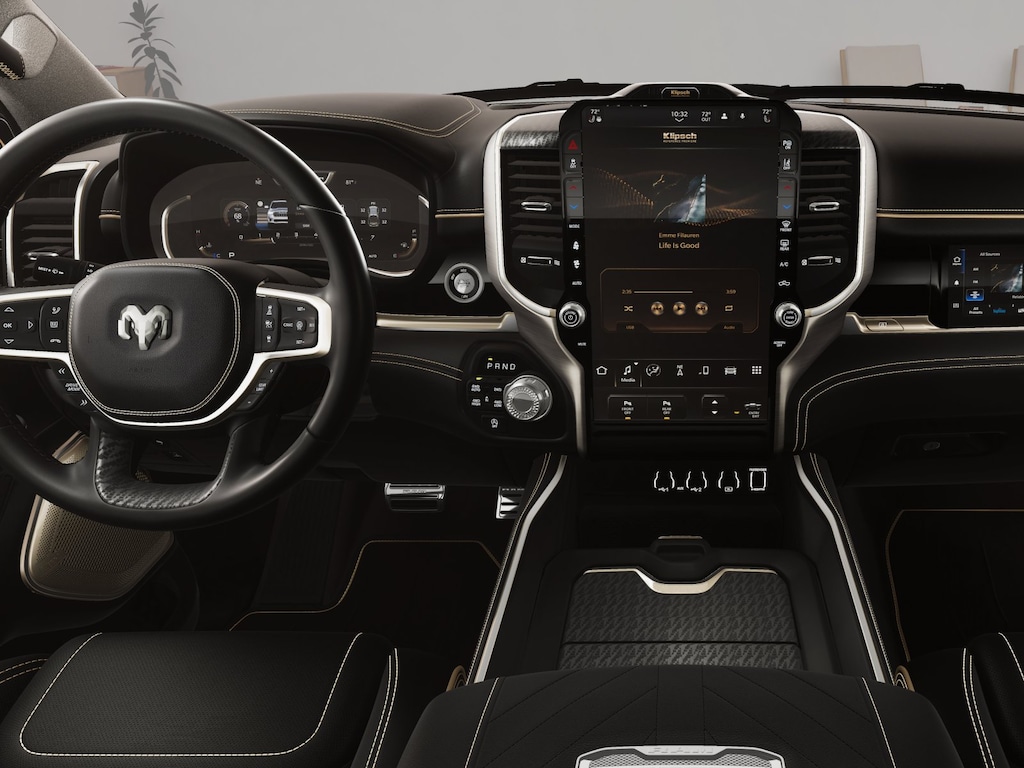 This 1500 is well equipped with Quick Order Package 22V Tungsten, 12-Way/1-Way Trailer Connector, 3.92 Rear Axle Ratio, 4-Wheel Disc Brakes, ABS brakes, Adjustable pedals, Air Conditioning, Alloy wheels, AM/FM radio, Apple CarPlay/Android Auto, Audio memory, Auto High-beam Headlights, Auto Power-Folding Mirrors, Auto-dimming door mirrors, Auto-Dimming Exterior Driver Mirror, Auto-dimming Rear-View mirror, Auto-leveling suspension, Automatic temperature control, Bodyside moldings, Brake assist, Bumpers: body-color, Chrome Exterior Mirrors, Compass, Delay-off headlights, Driver door bin, Driver vanity mirror, Dual front impact airbags, Dual front side impact airbags, Electronic Stability Control, Exterior 115V AC Outlet, Exterior Mirrors Courtesy Lamps, Exterior Mirrors w/Heating Element, Exterior Mirrors w/Memory, Exterior Mirrors w/Supplemental Signals, Exterior Parking Camera Rear, Front anti-roll bar, Front Bucket Seats, Front Center Armrest w/Storage, Front dual zone A/C, Front fog lights, Front reading lights, Front wheel independent suspension, Fully automatic headlights, Garage door transmitter, Heads-Up Display, Heated door mirrors, Heated front seats, Heated rear seats, Heated steering wheel, Illuminated entry, Leather steering wheel, Low tire pressure warning, Manufacturer's Statement of Origin, Memory seat, MyFlexCare Service Plan, Navigation System, Occupant sensing airbag, Outside temperature display, Overhead airbag, Overhead console, Panic alarm, Passenger door bin, Passenger vanity mirror, Pedal memory, Power adjustable front head restraints, Power door mirrors, Power driver seat, Power moonroof, Power passenger seat, Power steering, Power windows, Premium Leather Bucket Seats, Radio data system, Radio: Uconnect 5 Nav w/14.4" Display, Rain sensing wipers, Rear anti-roll bar, Rear reading lights, Rear seat center armrest, Rear step bumper, Rear window defroster, Remote keyless entry, Security system, Speed control, Split folding rear seat, Steering wheel mounted audio controls, Tachometer, Telescoping steering wheel, Tilt steering wheel, Traction control, Trip computer, Turn signal indicator mirrors, Variably intermittent wipers, Ventilated front seats, Ventilated rear seats, Voltmeter, and Wheels: 22" x 9" Polish/Painted w/Inserts.