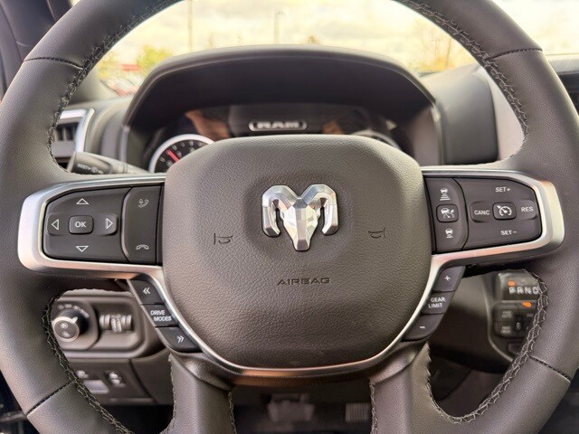 This 1500 is well equipped with Big Horn Level 2 Equipment Group (115V Auxiliary Power Outlet, 115V Auxiliary Rear Power Outlet, 12" Touchscreen Display, 2nd Row in Floor Storage Bins, 3 Rear Seat Head Restraints, 4 Way Front Headrests, 400W Inverter, 4G LTE Wi-Fi Hot Spot, 9 Amplified Speakers with Subwoofer, Air Conditioning ATC with Dual Zone Control, Apple CarPlay, Auto Power-Folding Mirrors, Auto-Dimming Exterior Driver Mirror, Auto-Dimming Rear-View Mirror, Black Exterior Mirrors, Black Premium Power Mirrors, Body Color Fender Flares, Bucket Seats, Center Console Parts Module, Cluster 7.0" TFT Color Display, Configurable Drive Mode, Connected Travel and Traffic Services, Connectivity - US/Canada, Convex Wide-Angle Exterior Mirror Insert, Deluxe Cloth Bucket Seats, Disassociated Touchscreen Display, Exterior Mirrors Courtesy Lamps, Exterior Mirrors with Heating Element, Exterior Mirrors with Supplemental Signals, Front Seat Back Map Pockets, Full Length Floor Console, Global Telematics Box Module, Glove Box Lamp, Google Android Auto, GPS Antenna Input, GPS Navigation, HD Radio, Heated Front Seats, Heated Steering Wheel, Integrated Center Stack Radio, Integrated Voice Command with Bluetooth, Leather Wrapped Steering Wheel, LED Dome Lamp with on/Off Switch, LED Footwell Lighting, Manual Adjust 4-Way Front Passenger Seat, Media Hub with 2 Charge Only USBs, Overhead LED Lamps, Power 2-Way Driver Lumbar Adjust, Power Adjust 8-Way Driver Seat, Power Adjustable Pedals, Premium Overhead Console, Radio: Uconnect 5 Navigation with 12.0" Display, Rear 60/40 Folding Seat, Rear Center Armrest, Rear Power Sliding Window, Rear Window Defroster, Remote Tailgate Release, Security Alarm, SiriusXM Radio Service, SiriusXM with 360L, Steering Wheel Mounted Audio Controls, Sun Visors with Illuminated Vanity Mirrors, Universal Garage Door Opener, USB Host Flip, and Wheels: 20" x 9" Aluminum Chrome Clad), Quick Order Package 21Z Big Horn, 4-Wheel Disc Brakes, 48V Belt Starter Generator, 6 Speakers, ABS brakes, Air Conditioning, Alloy wheels, AM/FM radio, Apple CarPlay/Android Auto, Auto High-beam Headlights, Brake assist, Bumpers: chrome, Cloth Bucket Seats, Compass, Delay-off headlights, Dome Dual LED Reading Lamp, Driver door bin, Dual front impact airbags, Dual front side impact airbags, Dual-Pane Panoramic Sunroof, Electronic Stability Control, Front anti-roll bar, Front Bucket Seats, Front Center Armrest w/Storage, Front fog lights, Front reading lights, Front wheel independent suspension, Fully automatic headlights, Heated door mirrors, Illuminated entry, Low tire pressure warning, Manual Adjust 4-Way Driver Seat, Manual Folding Exterior Mirrors, Manufacturer's Statement of Origin, Occupant sensing airbag, Outside temperature display, Overhead airbag, Overhead console, Panic alarm, ParkView Rear Back-Up Camera, Passenger door bin, Passenger vanity mirror, Power door mirrors, Power steering, Power windows, Radio data system, Radio: Uconnect 5 W with 8.4" Display, RAM Grille Badge - Chrome, Rear anti-roll bar, Rear step bumper, Rear Wheelhouse Liners, Remote keyless entry, Speed control, Supplier Part Tracking (J-1), Tachometer, Telescoping steering wheel, Tilt steering wheel, T Not all customers qualify for all rebates. See dealer for details. Price includes: $1000 - 2026 South BC Retail Bonus Cash . Exp. 01/05/2026 $3500 - 2026 National Retail Consumer Cash . Exp