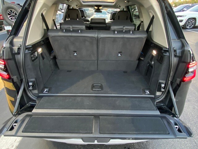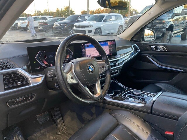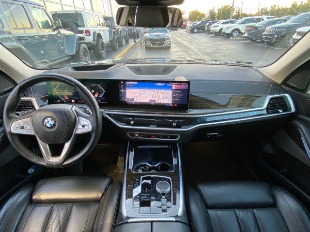 This X7 is well equipped with Connected Package Pro, 10 Speakers, 3.64 Axle Ratio, 3rd row seats: split-bench, 4-Wheel Disc Brakes, ABS brakes, Adaptive suspension, Air Conditioning, Alloy wheels, AM/FM radio: SiriusXM, AM/FM Stereo, Apple CarPlay & Android Auto Compatibility, Apple CarPlay Compatibility, Auto High-beam Headlights, Auto tilt-away steering wheel, Auto-dimming door mirrors, Auto-dimming Rear-View mirror, Auto-leveling suspension, Automatic temperature control, BMW Assist eCall, BMW TeleServices, Brake assist, Bumpers: body-color, Compass, ConnectedDrive Services, Delay-off headlights, Driver door bin, Driver vanity mirror, Dual front impact airbags, Dual front side impact airbags, Electronic Stability Control, Emergency communication system: BMW Assist eCall, Exterior Parking Camera Rear, Four wheel independent suspension, Front anti-roll bar, Front Bucket Seats, Front Center Armrest, Front dual zone A/C, Front reading lights, Fully automatic headlights, Garage door transmitter, Genuine wood console insert, Genuine wood dashboard insert, Genuine wood door panel insert, Head restraints memory, Heads-Up Display, Heated door mirrors, Heated front seats, Heated Multi-Contour Seats, Heated steering wheel, Hi-Fi Sound System, Illuminated entry, Knee airbag, Live Cockpit Pro w/Navi, Low tire pressure warning, Memory seat, Navigation system: BMW Maps Navigation, Occupant sensing airbag, Outside temperature display, Overhead airbag, Panic alarm, Passenger door bin, Passenger vanity mirror, Personal eSIM 5G, Power adjustable front head restraints, Power door mirrors, Power driver seat, Power Front Seats, Power moonroof: Panorama, Power passenger seat, Power steering, Power windows, Radio data system, Rain sensing wipers, Rear air conditioning, Rear anti-roll bar, Rear dual zone A/C, Rear reading lights, Rear seat center armrest, Rear window defroster, Rear window wiper, Reclining 3rd row seat, Remote keyless entry, Security system, Sensafin Upholstery, SiriusXM Satellite Radio, Speed control, Speed-sensing steering, Speed-Sensitive Wipers, Split folding rear seat, Spoiler, Sport steering wheel, Steering wheel memory, Steering wheel mounted audio controls, Tachometer, Telescoping steering wheel, Tilt steering wheel, Traction control, Trip computer, Turn signal indicator mirrors, Variably intermittent wipers, Wheels: 21" x 9.5" Y-Spoke Bi-Color, and Wireless Charging Device.