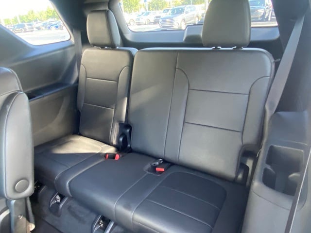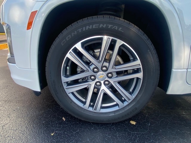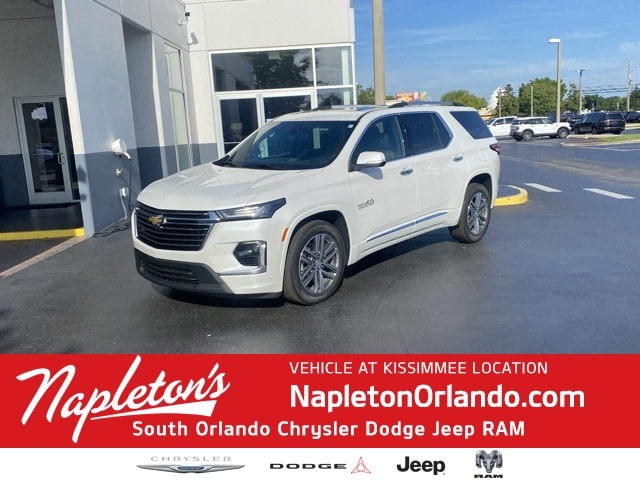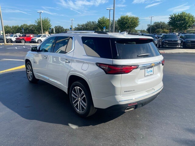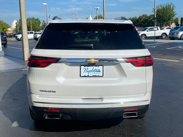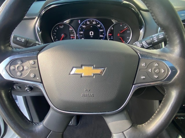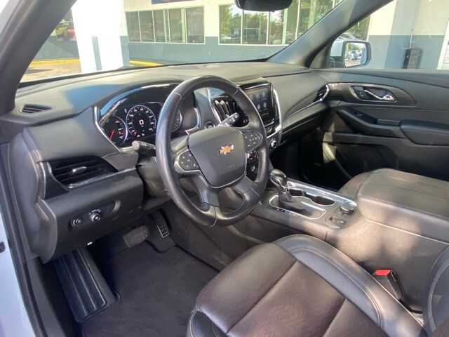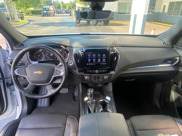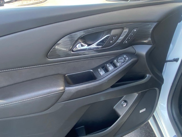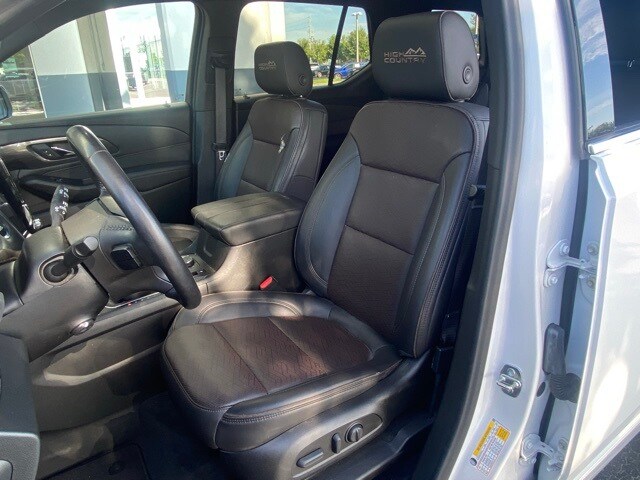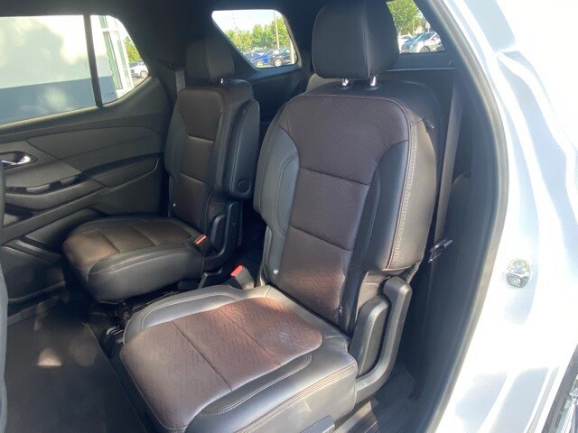 This Traverse is well equipped with Preferred Equipment Group 2LZ (Heated 2nd Row Outboard Position Seats and Rear Park Assist w/Audible Warning), 10 Speakers, 20" Polished Aluminum Wheels, 3.49 Axle Ratio, 3rd row seats: split-bench, 4-Wheel Disc Brakes, 6-Way Power Front Passenger Seat, 8-Way Power Driver Seat Adjuster, ABS brakes, Air Conditioning, Alloy wheels, AM/FM radio: SiriusXM with 360L, Apple CarPlay/Android Auto, Auto High-beam Headlights, Auto-dimming door mirrors, Auto-dimming Rear-View mirror, Automatic temperature control, Bose Premium 10-Speaker Audio System Feature, Brake assist, Bumpers: body-color, Compass, Delay-off headlights, Driver door bin, Driver vanity mirror, Dual front impact airbags, Dual front side impact airbags, Electronic Stability Control, Emergency communication system: OnStar Guidance, Four wheel independent suspension, Front anti-roll bar, Front Bucket Seats, Front Center Armrest, Front dual zone A/C, Front Passenger 2-Way Power Lumbar, Front reading lights, Fully automatic headlights, Garage door transmitter, Heated door mirrors, Heated Driver & Front Passenger Seats, Heated front seats, Heated rear seats, Heated steering wheel, Illuminated entry, Leather steering wheel, Low tire pressure warning, Memory seat, Navigation System, Not Equipped w/Heated Rear Outboard Seats (DISC), Not Equipped w/Rear Park Assist, Occupant sensing airbag, Outside temperature display, Overhead airbag, Overhead console, Panic alarm, Passenger door bin, Passenger vanity mirror, Perforated Leather-Appointed Seat Trim, Power door mirrors, Power Driver Lumbar Control, Power driver seat, Power Liftgate, Power moonroof: Dual SkyScape, Power passenger seat, Power steering, Power windows, Premium audio system: Chevrolet Infotainment 3 Plus, Radio data system, Radio: Chevrolet Infotainment 3 Plus System w/Navi, Rear air conditioning, Rear anti-roll bar, Rear reading lights, Rear window defroster, Rear window wiper, Remote keyless entry, Roof rack: rails only, Security system, SiriusXM w/360L, Speed control, Speed-sensing steering, Spoiler, Steering wheel memory, Steering wheel mounted audio controls, Tachometer, Telescoping steering wheel, Tilt steering wheel, Traction control, Trip computer, Turn signal indicator mirrors, Variably intermittent wipers, Ventilated Driver & Front Passenger Seats, Ventilated front seats, and Voltmeter.