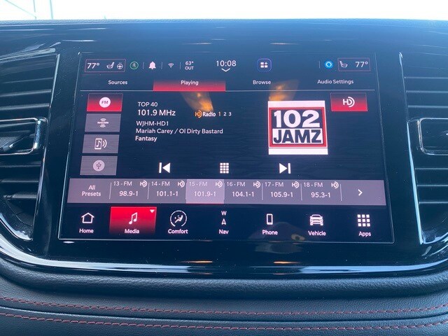 This Durango is well equipped with Quick Order Package 2BG GT Plus (1-Year Trial (Registration Required), 10.1" Touchscreen Display, 115V Auxiliary Power Outlet, 180 Amp Alternator, 4G LTE Wi-Fi Hot Spot, 7 & 4 Pin Wiring Harness, Adaptive Cruise Control w/Stop, Apple CarPlay, Auto-Dimming Exterior Driver Mirror, Black Roof Rails, Class IV Receiver Hitch, Connected Travel & Traffic Services, Disassociated Touchscreen Display, Dual Remote USB Port - Charge Only, Exterior Mirrors w/Heating Element, Exterior Mirrors w/Memory, Exterior Mirrors w/Supplemental Signals, Floor Console w/Leather Armrest, Full Speed Forward Collision Warning Plus, Global Telematics Box Module (TBM), Gloss Black Exterior Mirrors, Google Android Auto, GPS Antenna Input, GPS Navigation, HD Radio, Heated Second Row Seats, Heavy-Duty Engine Cooling, Integrated Center Stack Radio, Integrated Roof Rail Crossbars, Integrated Voice Command w/Bluetooth, Leather Trimmed Bucket Seats, Leather Wrapped Door Panels, LED Auxiliary Low Beam & Turn Signal, Power 6x9 Multi-Function Foldaway Mirrors, Power 8-Way Driver Memory 8-Way Passenger Seats, Power Driver/Passenger 4-Way Lumbar Adjust, Power Sunroof, Power Tilt & Telescopic Steering Column, Premium LED Fog Lamps, Radio: Uconnect 5 Nav w/10.1" Display, Radio/Driver Seat/Mirrors Memory, Red Accent Stitching, SiriusXM Guardian - Included Trial (B), SiriusXM w/360L, Trailer Brake Control, USB Host Flip, and Ventilated Front Seats), 3.27 Rear Axle Ratio, 3rd row seats: split-bench, 4-Wheel Disc Brakes, 6 Speakers, ABS brakes, Air Conditioning, Alloy wheels, AM/FM radio: SiriusXM, Apple CarPlay/Android Auto, Auto-dimming Rear-View mirror, Auto-leveling suspension, Automatic temperature control, Brake assist, Bumpers: body-color, Cloth Bucket Seats w/Shift Insert, Compass, Delay-off headlights, Driver door bin, Driver vanity mirror, Dual front impact airbags, Dual front side impact airbags, Electronic Stability Control, Four wheel independent suspension, Front anti-roll bar, Front Bucket Seats, Front Center Armrest w/Storage, Front dual zone A/C, Front License Plate Bracket, Front reading lights, Fully automatic headlights, Garage door transmitter, Heated door mirrors, Heated front seats, Heated steering wheel, Illuminated entry, Knee airbag, Leather steering wheel, Low tire pressure warning, Manufacturer's Statement of Origin, Occupant sensing airbag, Outside temperature display, Overhead airbag, Overhead console, Panic alarm, ParkView Rear Back-Up Camera, Passenger door bin, Passenger vanity mirror, Power door mirrors, Power driver seat, Power Liftgate, Power steering, Power windows, Radio data system, Radio: Uconnect 4 w/8.4" Display, Rear air conditioning, Rear anti-roll bar, Rear Load Leveling Suspension, Rear reading lights, Rear seat center armrest, Rear window defroster, Rear window wiper, Remote keyless entry, SiriusXM Radio Service, SiriusXM Satellite Radio, Speed control, Speed-sensing steering, Speed-Sensitive Wipers, Split folding rear seat, Spoiler, Sport steering wheel, Steering wheel mounted audio controls, Tachometer, Telescoping steering wheel, Tilt steering wheel, Traction control, Trip computer, Variably intermittent wipers, Voltmeter, and Wheels: 20" x 8.0" Fine Silver.