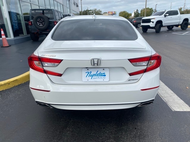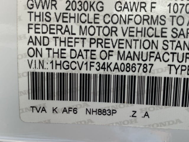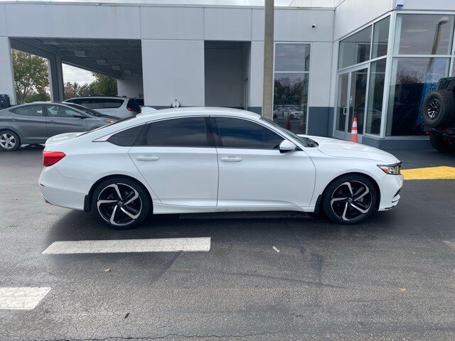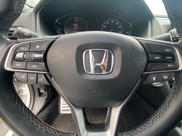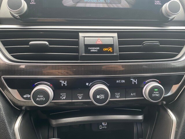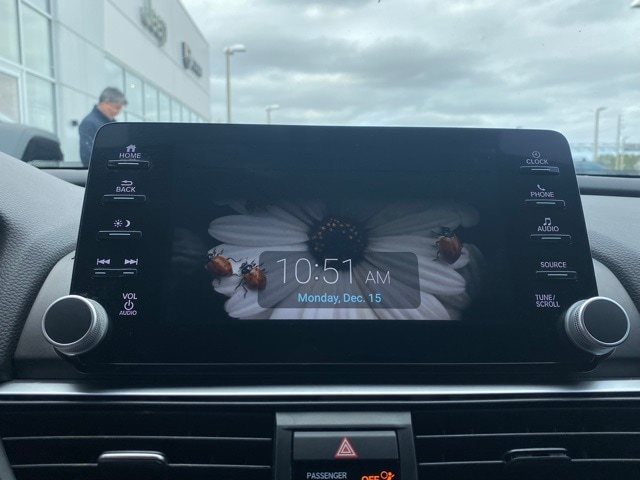 This Accord is well equipped with 4-Wheel Disc Brakes, 8 Speakers, ABS brakes, Air Conditioning, Alloy wheels, AM/FM radio, Apple CarPlay/Android Auto, Auto High-beam Headlights, Automatic temperature control, Brake assist, Bumpers: body-color, Cloth Seat Trim, Delay-off headlights, Driver door bin, Driver vanity mirror, Dual front impact airbags, Dual front side impact airbags, Electronic Stability Control, Emergency communication system: HondaLink, Exterior Parking Camera Rear, Forward collision: Collision Mitigation Braking System (CMBS) + FCW mitigation, Four wheel independent suspension, Front anti-roll bar, Front Bucket Seats, Front Center Armrest, Front dual zone A/C, Front fog lights, Front reading lights, Fully automatic headlights, Illuminated entry, Knee airbag, Leather Shift Knob, Leather steering wheel, Low tire pressure warning, Occupant sensing airbag, Outside temperature display, Overhead airbag, Overhead console, Panic alarm, Passenger door bin, Passenger vanity mirror, Power door mirrors, Power driver seat, Power steering, Power windows, Radio data system, Radio: 180-Watt AM/FM Audio System, Rear anti-roll bar, Rear seat center armrest, Rear window defroster, Remote keyless entry, Security system, Speed control, Speed-sensing steering, Speed-Sensitive Wipers, Split folding rear seat, Spoiler, Steering wheel mounted audio controls, Tachometer, Telescoping steering wheel, Tilt steering wheel, Traction control, Trip computer, Variably intermittent wipers, and Wheels: 19" Machine-Finished Alloy w/Black Inserts.