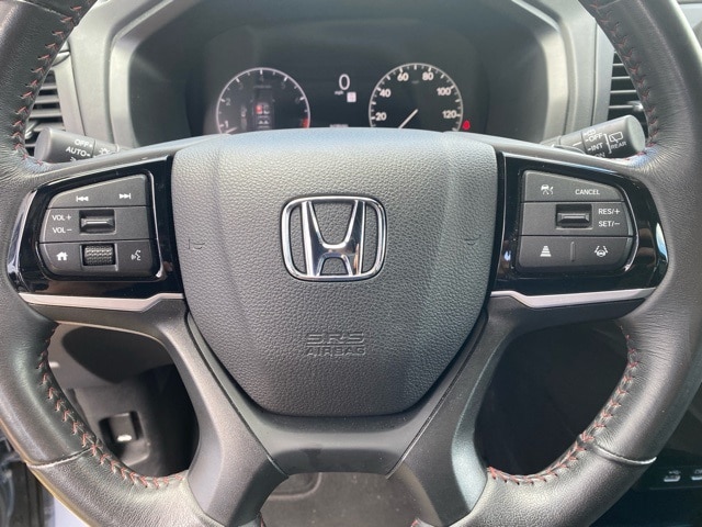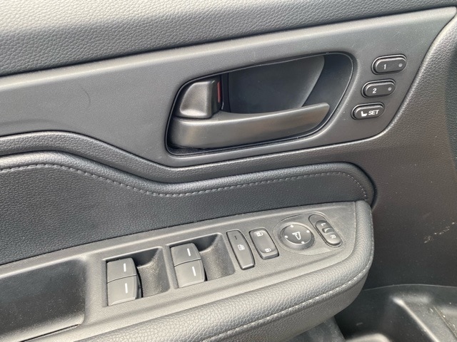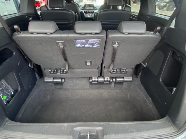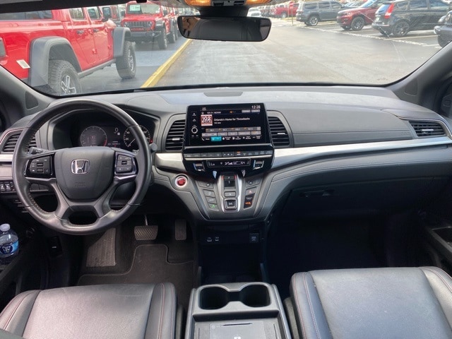This Odyssey is well equipped with 3rd row seats: split-bench, 4-Wheel Disc Brakes, 7 Speakers, ABS brakes, Adaptive Cruise Control: Adaptive Cruise Control (ACC) with Low-Speed Follow, Air Conditioning, Alloy wheels, AM/FM radio: SiriusXM, Anti-whiplash front head restraints, Apple CarPlay/Android Auto, Auto High-beam Headlights, Auto-dimming Rear-View mirror, Automatic temperature control, Blind Spot Information (BSI) System warning, Brake assist, Bumpers: body-color, Delay-off headlights, Driver door bin, Driver vanity mirror, Driver's Seat Mounted Armrest, Dual front impact airbags, Dual front side impact airbags, Electronic Stability Control, Exterior Parking Camera Rear, Four wheel independent suspension, Front anti-roll bar, Front Bucket Seats, Front dual zone A/C, Front fog lights, Front reading lights, Fully automatic headlights, Garage door transmitter: HomeLink, Heated door mirrors, Heated Front Bucket Seats, Heated front seats, Illuminated entry, Knee airbag, Lane departure: Lane Keeping Assist System (LKAS) active, Leather steering wheel, Leather Trimmed Seats, Low tire pressure warning, Memory seat, Occupant sensing airbag, Outside temperature display, Overhead airbag, Overhead console, Panic alarm, Passenger door bin, Passenger seat mounted armrest, Passenger vanity mirror, Power door mirrors, Power driver seat, Power Liftgate, Power moonroof, Power passenger seat, Power steering, Power windows, Radio data system, Radio: 160-Watt AM/FM/HD/SiriusXM Audio System, Rear air conditioning, Rear anti-roll bar, Rear reading lights, Rear seat center armrest, Rear window defroster, Rear window wiper, Reclining 3rd row seat, Remote keyless entry, Security system, Speed control, Speed-sensing steering, Speed-Sensitive Wipers, Split folding rear seat, Spoiler, Steering wheel mounted audio controls, Tachometer, Telescoping steering wheel, Tilt steering wheel, Traction control, Trip computer, Turn signal indicator mirrors, Variably intermittent wipers, and Wheels: 19" Gloss Black Alloy.
