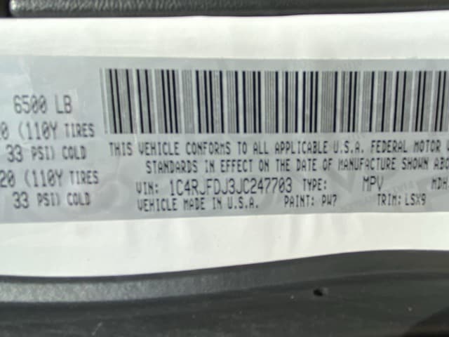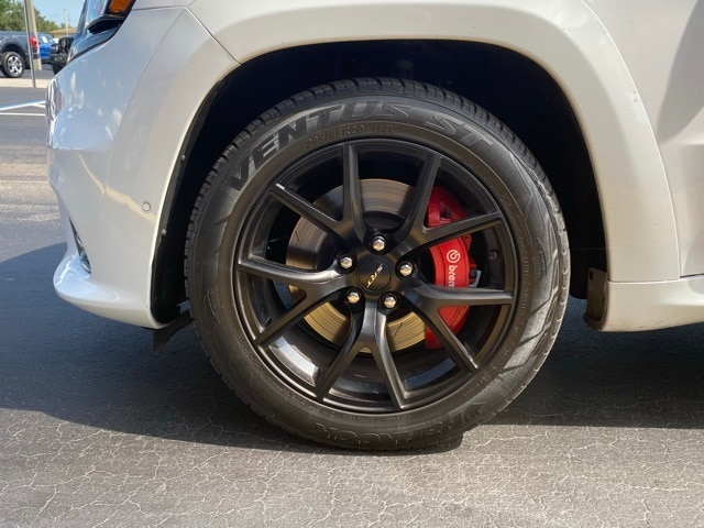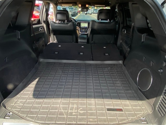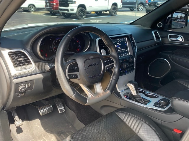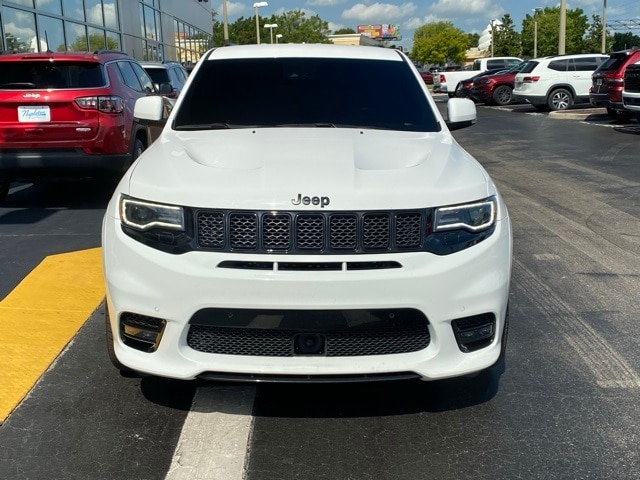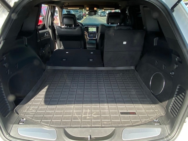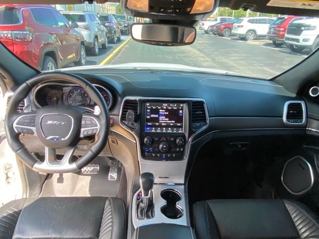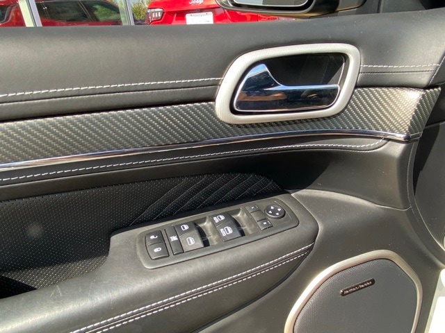 This Grand Cherokee is well equipped with High performance Audio (19 Speakers High Performance Audio and 825 Watt Amplifier), Quick Order Package 27L (DISC), Signature Leather Wrapped Interior Package (Laguna Leather Care Instruction Tag, Laguna Leather Reserve Door Trim, Laguna Leather Seats, Leather Wrapped Lower Panels, and Matte Carbon IP & Door Spears), Trailer Tow Group IV (7 & 4 Pin Wiring Harness, Class IV Receiver Hitch, and Heavy-Duty Engine Cooling), 10 Speakers, 3.70 Rear Axle Ratio, 4-Wheel Disc Brakes, ABS brakes, Adaptive suspension, Air Conditioning, Alloy wheels, AM/FM radio: SiriusXM, Anti-whiplash front head restraints, Apple CarPlay/Android Auto, Audio memory, Auto High-beam Headlights, Auto-dimming door mirrors, Auto-dimming Rear-View mirror, Automatic temperature control, Brake assist, Bumpers: body-color, Compass, Delay-off headlights, Driver door bin, Driver vanity mirror, Dual front impact airbags, Dual front side impact airbags, Electronic Stability Control, Emergency communication system: SiriusXM Guardian, Four wheel independent suspension, Front anti-roll bar, Front Bucket Seats, Front Center Armrest w/Storage, Front dual zone A/C, Front fog lights, Front reading lights, Fully automatic headlights, Garage door transmitter, Headlight cleaning, Heated door mirrors, Heated front seats, Heated rear seats, Heated steering wheel, High intensity discharge headlights: Bi-Xenon, High Performance Suspension, Illuminated entry, Knee airbag, Leather Shift Knob, Leather/Perforated Suede SRT Seats, Low tire pressure warning, Memory seat, Navigation System, Occupant sensing airbag, Outside temperature display, Overhead airbag, Overhead console, Panic alarm, ParkView Rear Back-Up Camera, Passenger door bin, Passenger vanity mirror, Power door mirrors, Power driver seat, Power Liftgate, Power passenger seat, Power steering, Power windows, Radio data system, Radio: Uconnect 4C Nav w/8.4" Display, Rain sensing wipers, Rear anti-roll bar, Rear reading lights, Rear seat center armrest, Rear window defroster, Rear window wiper, Remote keyless entry, Security system, Speed control, Speed-Sensitive Wipers, Split folding rear seat, Spoiler, Steering wheel mounted audio controls, Tachometer, Telescoping steering wheel, Tilt steering wheel, Traction control, Trip computer, Turn signal indicator mirrors, Variably intermittent wipers, Ventilated front seats, Wheels: 20" x 10.0" Satin Carbon Split 5 Spoke, and Wheels: 20" x 10" Black Satin Aluminum.