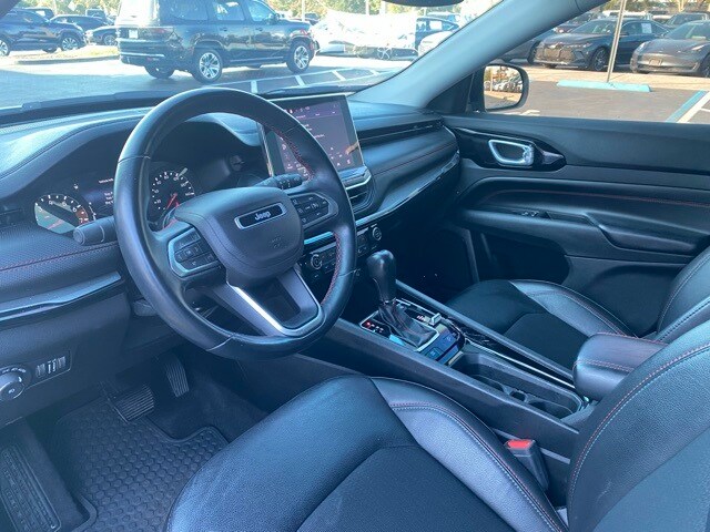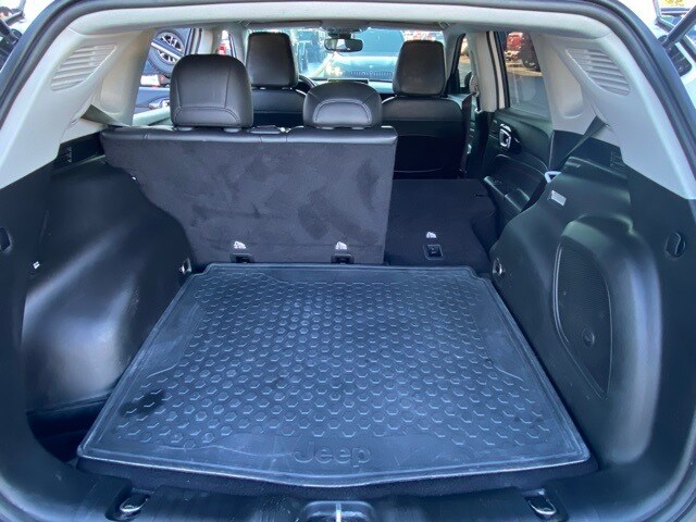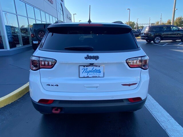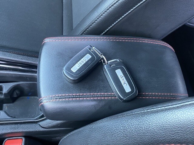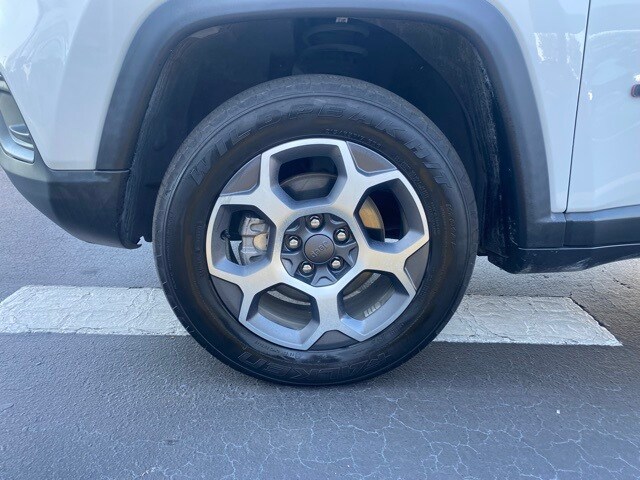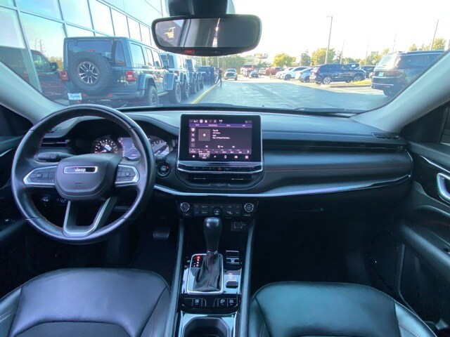 This Compass is well equipped with Quick Order Package 2GE, Sun and Sound Group (Power Front/Fixed Rear Full Sunroof and Premium Alpine Speaker System), Trailhawk Convenience Group (115V Auxiliary Power Outlet, 2nd Row USB Type A/C Charge Only, Heated Front Seats, Leather Wrapped Steering Wheel, Power 2-Way Driver Lumbar Adjust, Power Adjust 8-Way Driver Seat, Remote Start System, Reversible Carpet/Vinyl Cargo Mat, Vehicle Information Center, and Windshield Wiper De-Icer), 10.1" Touchscreen Display, 4-Wheel Disc Brakes, 4.334 Axle Ratio, 6 Speakers, ABS brakes, Air Conditioning, Alloy wheels, AM/FM radio: SiriusXM, Anti-whiplash front head restraints, Auto High-beam Headlights, Auto-dimming Rear-View mirror, Automatic temperature control, Brake assist, Bumpers: body-color, Compass, Delay-off headlights, Disassociated Touchscreen Display, Driver door bin, Driver vanity mirror, Dual front impact airbags, Dual front side impact airbags, Electronic Stability Control, Emergency communication system: SiriusXM Guardian, Four wheel independent suspension, Front anti-roll bar, Front Bucket Seats, Front Center Armrest w/Storage, Front dual zone A/C, Front fog lights, Front reading lights, Fully automatic headlights, Global Telematics Box Module (TBM), Heated door mirrors, Illuminated entry, Knee airbag, Leather Shift Knob, Low tire pressure warning, Occupant sensing airbag, Outside temperature display, Overhead airbag, Overhead console, Panic alarm, ParkView Rear Back-Up Camera, Passenger door bin, Passenger vanity mirror, Power door mirrors, Power steering, Power windows, Premium Cloth/Leather Trim Bucket Seats, Radio: Uconnect 5 w/10.1" Display, Rain sensing wipers, Rear anti-roll bar, Rear seat center armrest, Rear window defroster, Rear window wiper, Remote keyless entry, Roof rack: rails only, Security system, Speed control, Split folding rear seat, Spoiler, Steering wheel mounted audio controls, Tachometer, Telescoping steering wheel, Tilt steering wheel, Traction control, Trip computer, Turn signal indicator mirrors, Variably intermittent wipers, and Wheels: 17" x 6.5" Painted Diamond Cut Aluminum.