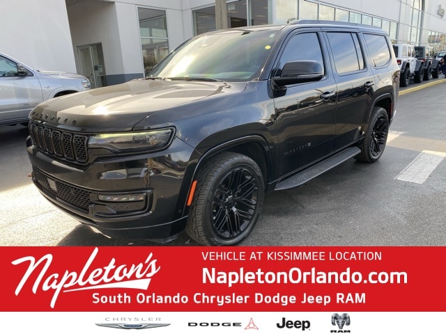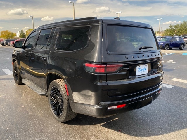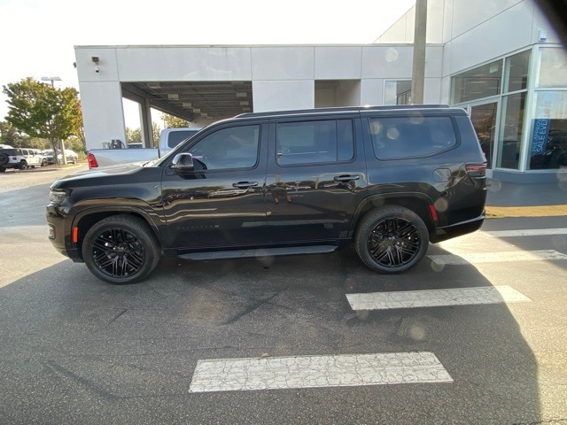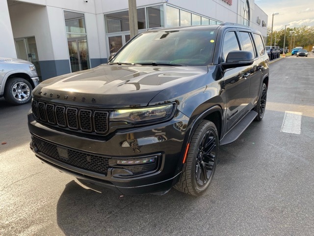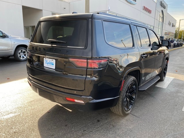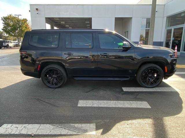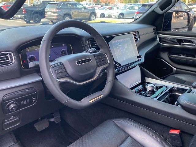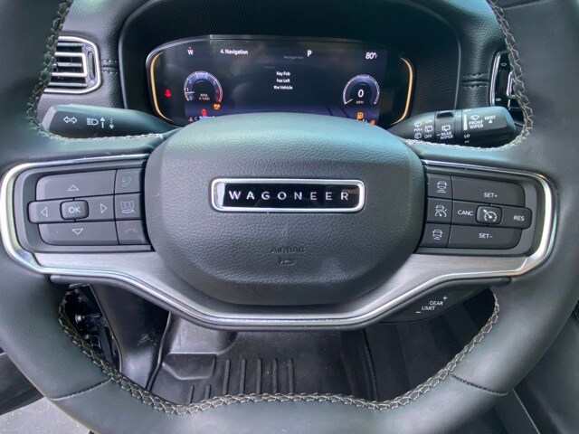 This Wagoneer is well equipped with Quick Order Package 25F Carbide (Adjustable Roof Rail Crossbars, Black Interior Accents, and Wheels: 20" x 9" Gloss Black Painted Aluminum), 10 Speakers, 3.55 Rear Axle Ratio, 3rd row seats: bench, 4-Wheel Disc Brakes, ABS brakes, Adjustable pedals, Air Conditioning, Alloy wheels, AM/FM radio: SiriusXM with 360L, Anti-whiplash front head restraints, Audio memory, Auto-dimming door mirrors, Auto-dimming Rear-View mirror, Auto-leveling suspension, Automatic temperature control, Brake assist, Bumpers: body-color, Compass, Delay-off headlights, Driver door bin, Driver vanity mirror, Driver's Seat Mounted Armrest, Dual front impact airbags, Dual front side impact airbags, Electronic Stability Control, Emergency communication system: Automatic SOS Call, Exterior Parking Camera Rear, Four wheel independent suspension, Front anti-roll bar, Front Bucket Seats, Front Center Armrest w/Storage, Front dual zone A/C, Front fog lights, Front reading lights, Fully automatic headlights, Garage door transmitter, Genuine wood console insert, Genuine wood dashboard insert, Genuine wood door panel insert, Heated door mirrors, Heated front seats, Heated steering wheel, Illuminated entry, Knee airbag, Leather Trimmed Bucket Seats, Low tire pressure warning, Memory seat, Navigation System, Normal Duty Suspension, Occupant sensing airbag, Outside temperature display, Overhead airbag, Overhead console, Panic alarm, Passenger door bin, Passenger seat mounted armrest, Passenger vanity mirror, Pedal memory, Power adjustable front head restraints, Power door mirrors, Power driver seat, Power Liftgate, Power passenger seat, Power steering, Power windows, Radio data system, Radio: Uconnect 5 Nav w/10.1" Display, Rain sensing wipers, Rear air conditioning, Rear anti-roll bar, Rear dual zone A/C, Rear reading lights, Rear seat center armrest, Rear window defroster, Rear window wiper, Reclining 3rd row seat, Remote keyless entry, Security system, Speed control, Speed-sensing steering, Speed-Sensitive Wipers, Split folding rear seat, Steering wheel memory, Steering wheel mounted audio controls, Tachometer, Telescoping steering wheel, Tilt steering wheel, Traction control, Trip computer, Turn signal indicator mirrors, Variably intermittent wipers, Ventilated front seats, Voltmeter, Wheels: 20" x 9.0" Premium 2 Aluminum, and Wheels: 22" x 9.0" Painted Gloss Black.