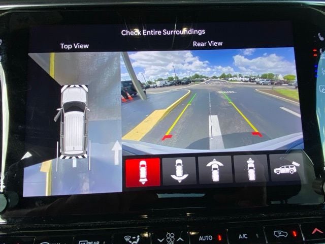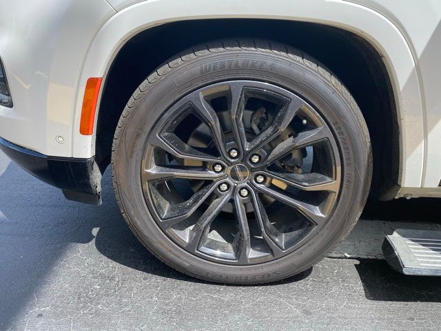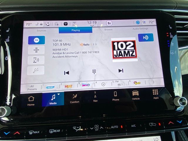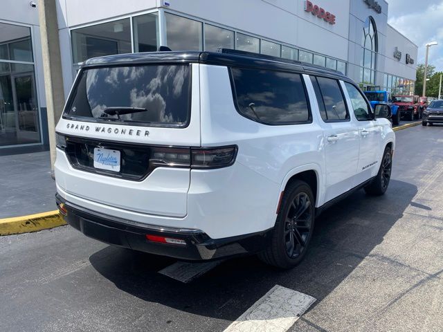 This Grand Wagoneer L is well equipped with Quick Order Package 28T Obsidian, Two Tone Paint Group, 19 Speakers, 3.92 Rear Axle Ratio, 3rd row seats: bench, 4-Wheel Disc Brakes, ABS brakes, Adjustable pedals, Air Conditioning, Alloy wheels, AM/FM radio: SiriusXM with 360L, Anti-whiplash front head restraints, Apple CarPlay/Android Auto, Audio memory, Auto High-beam Headlights, Auto-dimming door mirrors, Auto-dimming Rear-View mirror, Auto-leveling suspension, Automatic temperature control, Brake assist, Bumpers: body-color, Compass, Delay-off headlights, Driver door bin, Driver vanity mirror, Driver's Seat Mounted Armrest, Dual front impact airbags, Dual front side impact airbags, Electronic Stability Control, Emergency communication system, Four wheel independent suspension, Front anti-roll bar, Front Bucket Seats, Front Center Armrest w/Storage, Front dual zone A/C, Front fog lights, Front reading lights, Fully automatic headlights, Garage door transmitter, Genuine wood console insert, Genuine wood dashboard insert, Genuine wood door panel insert, Heads-Up Display, Heated door mirrors, Heated front seats, Heated rear seats, Heated steering wheel, Illuminated entry, Knee airbag, Leather steering wheel, Leather Trimmed Bucket Seats, Low tire pressure warning, Memory seat, Navigation System, Normal Duty Suspension, Occupant sensing airbag, Outside temperature display, Overhead airbag, Overhead console, Panic alarm, Passenger door bin, Passenger seat mounted armrest, Passenger vanity mirror, Pedal memory, Power adjustable front head restraints, Power door mirrors, Power driver seat, Power Liftgate, Power moonroof, Power passenger seat, Power steering, Power windows, Radio data system, Radio: Uconnect 5 Nav w/12.0" Display, Rain sensing wipers, Rear air conditioning, Rear anti-roll bar, Rear dual zone A/C, Rear reading lights, Rear seat center armrest, Rear window defroster, Rear window wiper, Reclining 3rd row seat, Remote keyless entry, Security system, Speed control, Speed-sensing steering, Speed-Sensitive Wipers, Split folding rear seat, Steering wheel memory, Steering wheel mounted audio controls, Tachometer, Telescoping steering wheel, Tilt steering wheel, Traction control, Trip computer, Turn signal indicator mirrors, Variably intermittent wipers, Ventilated front seats, and Voltmeter.