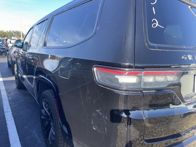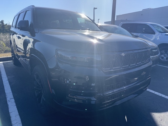 This Grand Wagoneer L is well equipped with Obsidian Appearance Package, Quick Order Package 28T Obsidian (23 Speaker McIntosh Reference Audio System, Adjustable Roof Rail Crossbars, Black Interior Accents, Front Console Cooler, Front Passenger Interactive Display, Gloss Black Upper & Lower DLO Molding, Piano Black Exterior Accents, Rearview Autodim Digital Display Mirror, Ventilated Rear Seats, and Wheels: 22" x 9.0" Tinted Polished w/Black Insert), Two Tone Paint Group, 19 Speakers, 3.92 Rear Axle Ratio, 3rd row seats: bench, 4-Wheel Disc Brakes, ABS brakes, Adjustable pedals, Air Conditioning, Alloy wheels, AM/FM radio: SiriusXM with 360L, Anti-whiplash front head restraints, Apple CarPlay/Android Auto, Audio memory, Auto High-beam Headlights, Auto-dimming door mirrors, Auto-dimming Rear-View mirror, Auto-leveling suspension, Automatic temperature control, Brake assist, Bumpers: body-color, Compass, Delay-off headlights, Driver door bin, Driver vanity mirror, Driver's Seat Mounted Armrest, Dual front impact airbags, Dual front side impact airbags, Electronic Stability Control, Emergency communication system, Four wheel independent suspension, Front anti-roll bar, Front Bucket Seats, Front Center Armrest w/Storage, Front dual zone A/C, Front fog lights, Front reading lights, Fully automatic headlights, Garage door transmitter, Genuine wood console insert, Genuine wood dashboard insert, Genuine wood door panel insert, Heads-Up Display, Heated door mirrors, Heated front seats, Heated rear seats, Heated steering wheel, Illuminated entry, Knee airbag, Leather steering wheel, Leather Trimmed Bucket Seats, Low tire pressure warning, Memory seat, Navigation System, Normal Duty Suspension, Occupant sensing airbag, Outside temperature display, Overhead airbag, Overhead console, Panic alarm, Passenger door bin, Passenger seat mounted armrest, Passenger vanity mirror, Pedal memory, Power adjustable front head restraints, Power door mirrors, Power driver seat, Power Liftgate, Power moonroof, Power passenger seat, Power steering, Power windows, Radio data system, Radio: Uconnect 5 Nav w/12.0" Display, Rain sensing wipers, Rear air conditioning, Rear anti-roll bar, Rear dual zone A/C, Rear reading lights, Rear seat center armrest, Rear window defroster, Rear window wiper, Reclining 3rd row seat, Remote keyless entry, Security system, Speed control, Speed-sensing steering, Speed-Sensitive Wipers, Split folding rear seat, Steering wheel memory, Steering wheel mounted audio controls, Tachometer, Telescoping steering wheel, Tilt steering wheel, Traction control, Trip computer, Turn signal indicator mirrors, Variably intermittent wipers, Ventilated front seats, and Voltmeter.