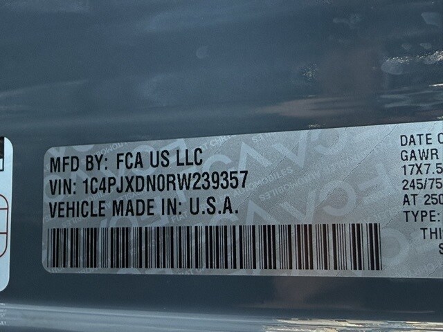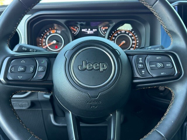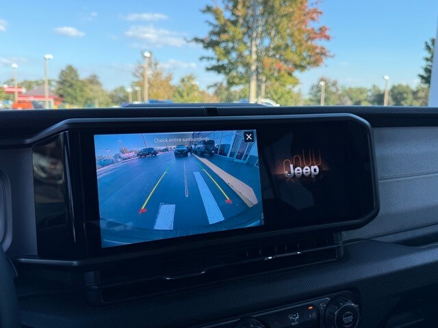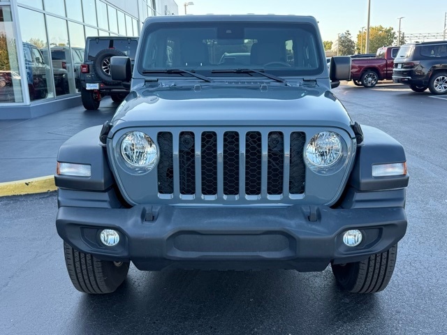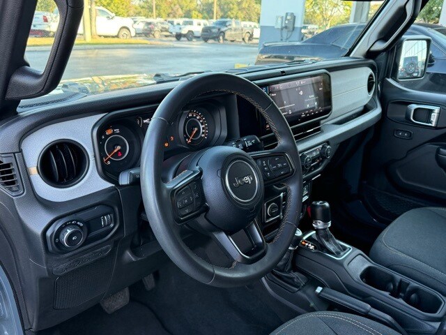 This Wrangler is well equipped with 110 MPH Vehicle Max Speed Calibration, 4-Wheel Disc Brakes, 8 Speakers, ABS brakes, Air Conditioning, AM/FM radio, Apple CarPlay/Android Auto, Aux Battery, Brake assist, Cloth Low-Back Bucket Seats, Compass, Delay-off headlights, Driver door bin, Driver vanity mirror, Dual front impact airbags, Dual front side impact airbags, Electronic Stability Control, Front anti-roll bar, Front Bucket Seats, Front Center Armrest w/Storage, Front fog lights, Front reading lights, Integrated roll-over protection, Low tire pressure warning, Non-Lock Fuel Cap w/o Discriminator, Normal Duty Suspension, Occupant sensing airbag, Outside temperature display, Overhead airbag, ParkView Rear Back-Up Camera, Passenger door bin, Passenger vanity mirror, Power steering, Radio data system, Radio: Uconnect 5 w/12.3" Display, Rear anti-roll bar, Rear reading lights, Speed control, Split folding rear seat, Steering wheel mounted audio controls, Stop-Start Dual Battery System, Tachometer, Telescoping steering wheel, Tilt steering wheel, Traction control, Trip computer, Variably intermittent wipers, and Wheels: 17" x 7.5" Black Steel Styled.