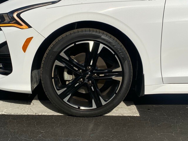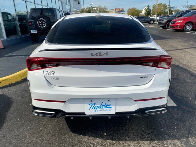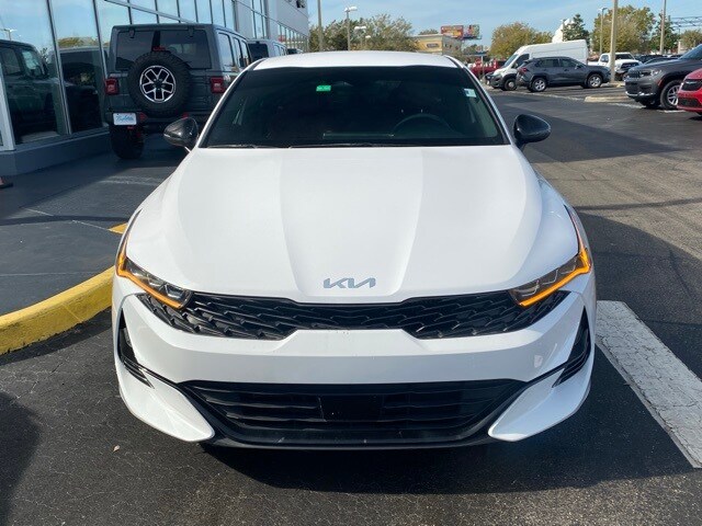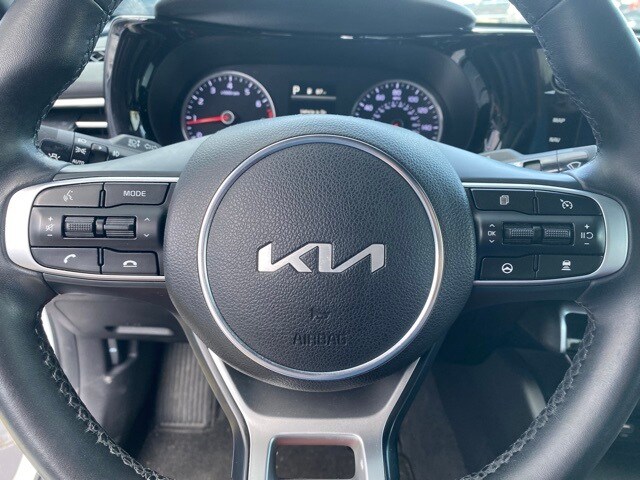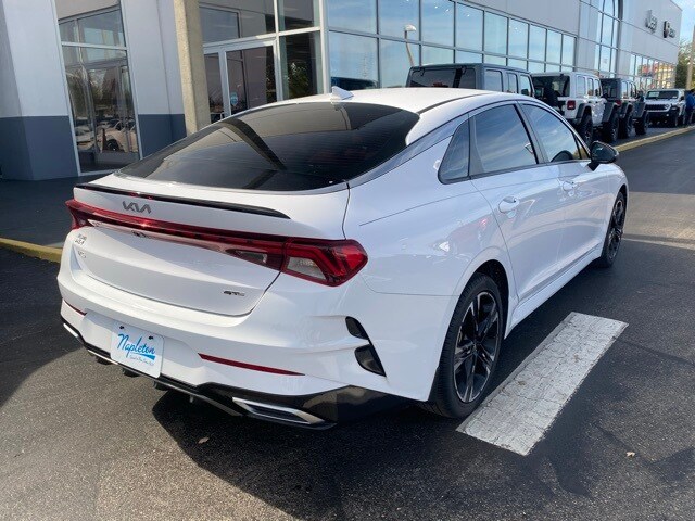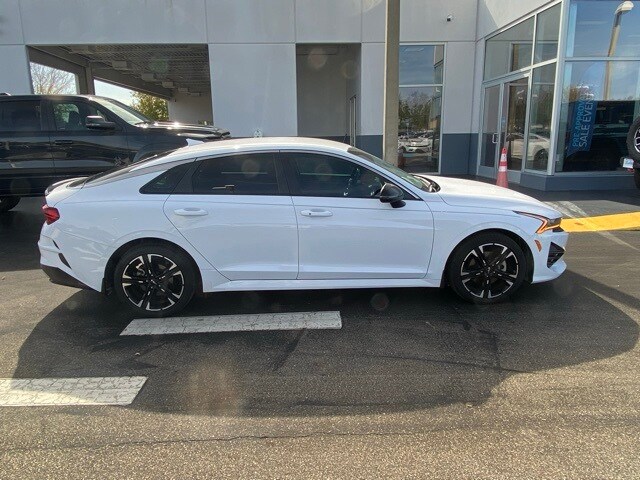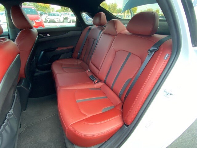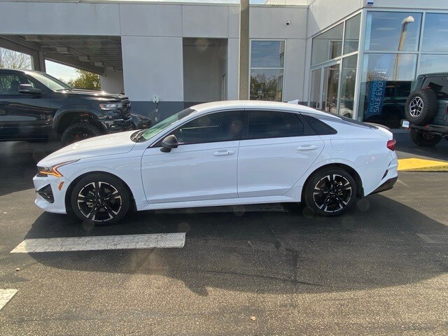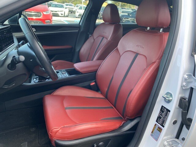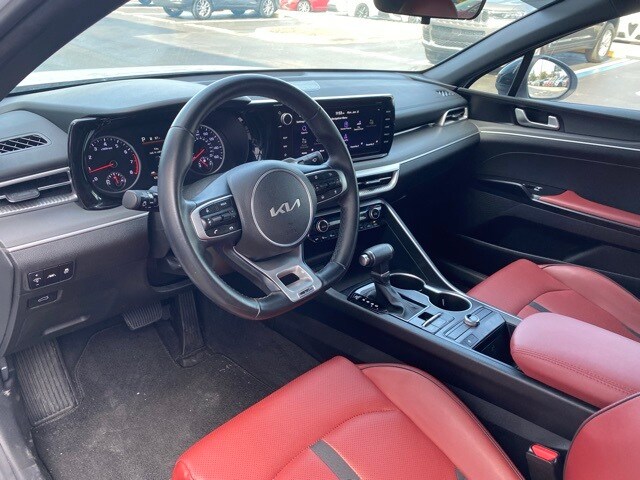 This K5 is well equipped with GT-Line Premium Package (Forward Collision Avoidance-Assist, Highway Driving Assist, LED Projection Headlamps, and Smart Cruise Control w/Stop & Go), GT-Line Red Interior Package, 4-Wheel Disc Brakes, 6 Speakers, ABS brakes, Air Conditioning, Alloy wheels, AM/FM radio: SiriusXM, Apple CarPlay & Android Auto, Auto High-beam Headlights, Automatic temperature control, Brake assist, Bumpers: body-color, Cargo Net, Carpeted Floor Mats, Cloth/SynTex Seat Trim, Delay-off headlights, Driver door bin, Driver vanity mirror, Dual front impact airbags, Dual front side impact airbags, Electronic Stability Control, Four wheel independent suspension, Front anti-roll bar, Front Bucket Seats, Front Center Armrest, Front dual zone A/C, Front fog lights, Front reading lights, Fully automatic headlights, Heated door mirrors, Illuminated entry, Knee airbag, Low tire pressure warning, Navigation System, Occupant sensing airbag, Outside temperature display, Overhead airbag, Overhead console, Panic alarm, Passenger door bin, Passenger vanity mirror, Power door mirrors, Power driver seat, Power steering, Power windows, Radio data system, Radio: AM/FM/MP3 Audio System, Rear anti-roll bar, Rear seat center armrest, Rear side impact airbag, Rear window defroster, Remote keyless entry, Security system, Speed control, Speed-sensing steering, Split folding rear seat, Spoiler, Sport steering wheel, Steering wheel mounted audio controls, Tachometer, Telescoping steering wheel, Tilt steering wheel, Traction control, Trip computer, Turn signal indicator mirrors, Variably intermittent wipers, and Wheels: 18" Gloss Black Machined Finish Alloy.