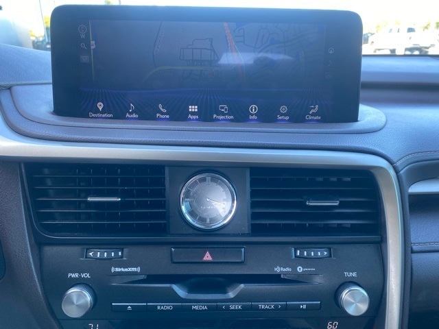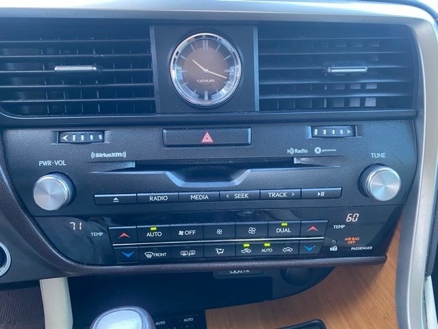 This RX is well equipped with 3.54 Axle Ratio, 4-Wheel Disc Brakes, 9 Speakers, ABS brakes, Air Conditioning, Alloy wheels, AM/FM radio: SiriusXM, AM/FM/CD Radio, Anti-whiplash front head restraints, Apple CarPlay/Android Auto, Auto High-beam Headlights, Auto tilt-away steering wheel, Auto-dimming door mirrors, Auto-dimming Rear-View mirror, Automatic temperature control, Brake assist, Bumpers: body-color, CD player, Delay-off headlights, Driver door bin, Driver vanity mirror, Dual front impact airbags, Dual front side impact airbags, Electronic Stability Control, Emergency communication system: Lexus Enform Safety Connect, Exterior Parking Camera Rear, Four wheel independent suspension, Front anti-roll bar, Front Bucket Seats, Front Center Armrest, Front dual zone A/C, Front fog lights, Front reading lights, Fully automatic headlights, Garage door transmitter: HomeLink, Genuine wood console insert, Genuine wood door panel insert, Heated door mirrors, Illuminated entry, Knee airbag, Lane Departure Warning System, Leather Shift Knob, Leather steering wheel, Low tire pressure warning, NuLuxe Seat Trim, Occupant sensing airbag, Outside temperature display, Overhead airbag, Overhead console, Panic alarm, Passenger door bin, Passenger vanity mirror, Power door mirrors, Power driver seat, Power Liftgate, Power passenger seat, Power steering, Power windows, Radio data system, Rain sensing wipers, Rear anti-roll bar, Rear reading lights, Rear seat center armrest, Rear side impact airbag, Rear window defroster, Rear window wiper, Remote keyless entry, Security system, Speed control, Speed-sensing steering, Split folding rear seat, Spoiler, Steering wheel mounted audio controls, Telescoping steering wheel, Tilt steering wheel, Traction control, Trip computer, Turn signal indicator mirrors, Variably intermittent wipers, and Wheels: 18" Split-5-Spoke Alloy.