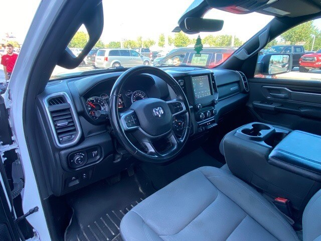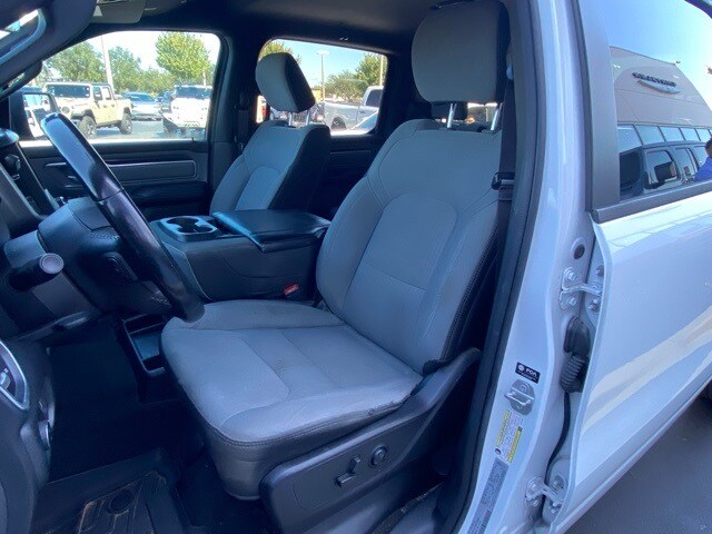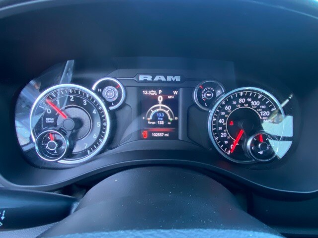This 1500 is well equipped with Bed Utility Group (MOPAR 4 Adjustable Cargo Tie-Down Hooks, MOPAR Deployable Bed Step, MOPAR Spray In Bedliner, and Pick-Up Box Lighting), Big Horn Level 1 Equipment Group (2nd Row In Floor Storage Bins, Auto-Dimming Exterior Driver Mirror, Auto-Dimming Rear-View Mirror, Black Premium Power Mirrors, Class IV Receiver Hitch, Cluster 3.5" TFT Color Display, Exterior Mirrors Courtesy Lamps, Exterior Mirrors w/Supplemental Signals, Foam Bottle Insert (Door Trim Panel), For More Info, Call 800-643-2112, Glove Box Lamp, Power 4-Way Driver Lumbar Adjust, Power 8-Way Driver Seat, Power Adjustable Pedals, Power-Folding Mirrors, Radio: Uconnect 4 w/8.4" Display, Rear Dome w/On/Off Switch Lamp, Rear Power Sliding Window, Rear Window Defroster, SiriusXM Radio Service, SiriusXM Satellite Radio, Sun Visors w/Illuminated Vanity Mirrors, and Universal Garage Door Opener), Quick Order Package 25Z Big Horn (Big Horn Badge), RAM Telematics (1 Year Telematics Service), 3 Rear Seat Head Restraints, 3.21 Rear Axle Ratio, 4 Way Front Headrests, 4-Wheel Disc Brakes, 40/20/40 Split Bench Seat, 48V Belt Starter Generator, 6 Speakers, ABS brakes, Air Conditioning, Alloy wheels, AM/FM radio, Black Exterior Mirrors, Brake assist, Bumpers: chrome, Cloth Bench Seat, Compass, Delay-off headlights, Driver door bin, Dual front impact airbags, Dual front side impact airbags, Electronic Stability Control, Front anti-roll bar, Front Center Armrest w/Storage, Front fog lights, Front License Plate Bracket, Front reading lights, Front Seat Back Map Pockets, Front wheel independent suspension, Fully automatic headlights, GPS Antenna Input, Heated door mirrors, Illuminated entry, Integrated Voice Command w/Bluetooth, Leather steering wheel, Low tire pressure warning, Manufacturer's Statement of Origin, Occupant sensing airbag, Outside temperature display, Overhead airbag, Overhead console, Panic alarm, ParkView Rear Back-Up Camera, Passenger door bin, Passenger vanity mirror, Power door mirrors, Power steering, Power windows, Radio data system, Radio: Uconnect 3 w/5" Display, Rear 60/40 Folding Seat, Rear anti-roll bar, Rear seat center armrest, Rear step bumper, Remote keyless entry, Speed control, Split folding rear seat, Steering wheel mounted audio controls, Tachometer, Telescoping steering wheel, Tilt steering wheel, Traction control, Trailer Brake Control, Trip computer, Variably intermittent wipers, Voltmeter, and Wheels: 18" x 8" Cast-Aluminum Painted.