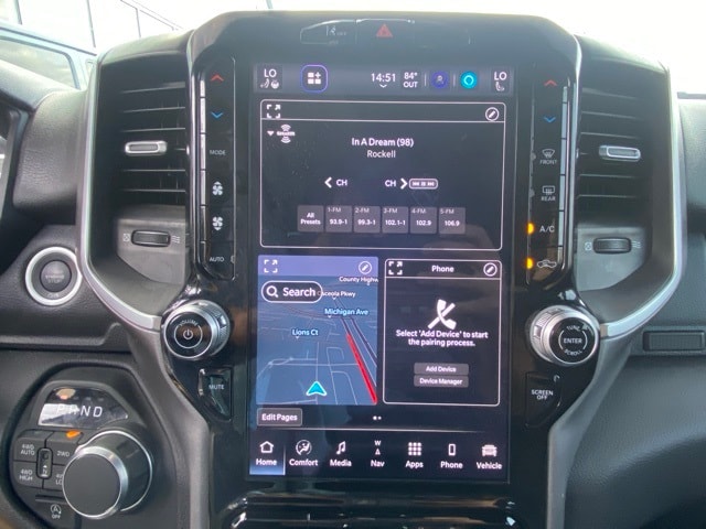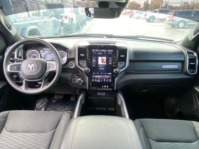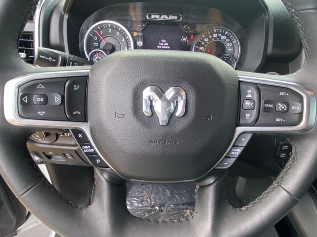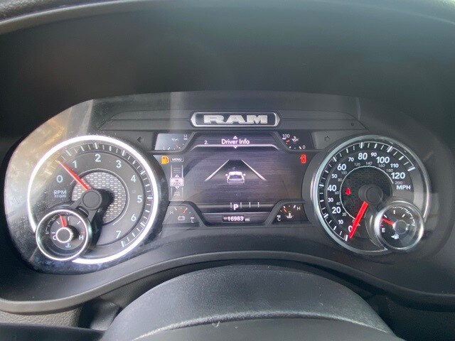 This 1500 is well equipped with Big Horn Level 2 Equipment Group (115V Auxiliary Power Outlet, 115V Auxiliary Rear Power Outlet, 12" Touchscreen Display, 2nd Row In Floor Storage Bins, 400W Inverter, 4G LTE Wi-Fi Hot Spot, 9 Amplified Speakers w/Subwoofer, Air Conditioning ATC w/Dual Zone Control, Apple CarPlay, Auto Power-Folding Mirrors, Auto-Dimming Exterior Driver Mirror, Auto-Dimming Rear-View Mirror, Black Exterior Mirrors, Black Premium Power Mirrors, Cluster 7.0" TFT Color Display, Configurable Drive Mode, Connected Travel & Traffic Services, Connectivity - US/Canada, Convex Wide-Angle Exterior Mirror Insert, Exterior Mirrors Courtesy Lamps, Exterior Mirrors w/Heating Element, Exterior Mirrors w/Supplemental Signals, Glove Box Lamp, Google Android Auto, GPS Antenna Input, GPS Navigation, HD Radio, Heated Front Seats, Heated Steering Wheel, Integrated Voice Command w/Bluetooth, Leather Wrapped Steering Wheel, LED Dome Lamp w/On/Off Switch, LED Footwell Lighting, Media Hub w/2 Charge Only USBs, Overhead LED Lamps, Power 2-Way Driver Lumbar Adjust, Power Adjust 8-Way Driver Seat, Power Adjustable Pedals, Premium Overhead Console, Radio: Uconnect 5 Nav w/12.0" Display, Rear Power Sliding Window, Rear Window Defroster, Remote Tailgate Release, Security Alarm, SiriusXM w/360L, Steering Wheel Mounted Audio Controls, Sun Visors w/Illuminated Vanity Mirrors, Universal Garage Door Opener, and USB Host Flip), Quick Order Package 21Z Big Horn, 3 Rear Seat Head Restraints, 4 Way Front Headrests, 4-Wheel Disc Brakes, 6 Speakers, ABS brakes, Air Conditioning, Alloy wheels, AM/FM radio, Apple CarPlay/Android Auto, Auto High-beam Headlights, Brake assist, Bumpers: chrome, Cloth Bench Seat, Compass, Delay-off headlights, Driver door bin, Dual front impact airbags, Dual front side impact airbags, Electronic Stability Control, Front anti-roll bar, Front Center Armrest w/Storage, Front fog lights, Front License Plate Bracket, Front reading lights, Front Seat Back Map Pockets, Front wheel independent suspension, Fully automatic headlights, Heated door mirrors, Illuminated entry, Low tire pressure warning, Manual Adjust 4-Way Front Passenger Seat, Manual Folding Exterior Mirrors, Manufacturer's Statement of Origin, Occupant sensing airbag, Outside temperature display, Overhead airbag, Overhead console, Panic alarm, ParkView Rear Back-Up Camera, Passenger door bin, Passenger vanity mirror, Power door mirrors, Power steering, Power windows, Radio data system, Radio: Uconnect 5 W w/8.4" Display, RAM Grille Badge - Chrome, Rear 60/40 Folding Seat, Rear anti-roll bar, Rear seat center armrest, Rear step bumper, Remote keyless entry, Speed control, Split folding rear seat, Supplier Part Tracking (J-1), Tachometer, Telescoping steering wheel, Tilt steering wheel, Traction control, Trip computer, Variably intermittent wipers, Voltmeter, and Wheels: 18" x 8" Cast-Aluminum Painted.