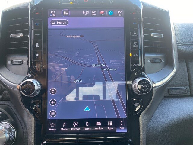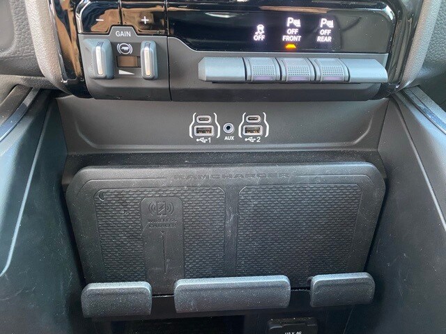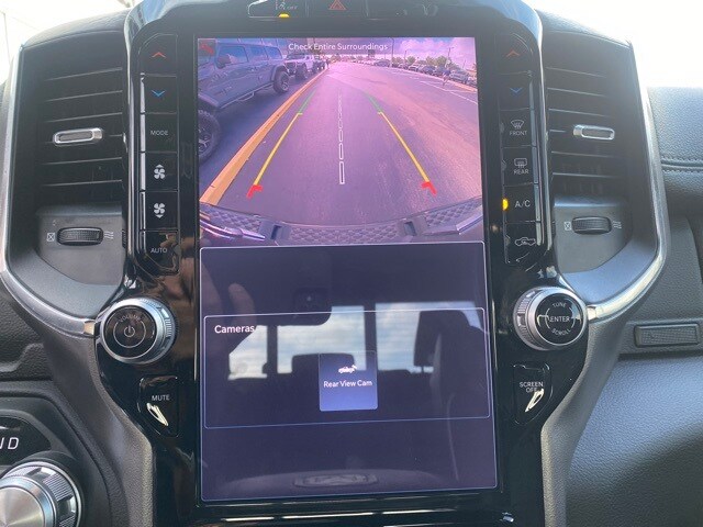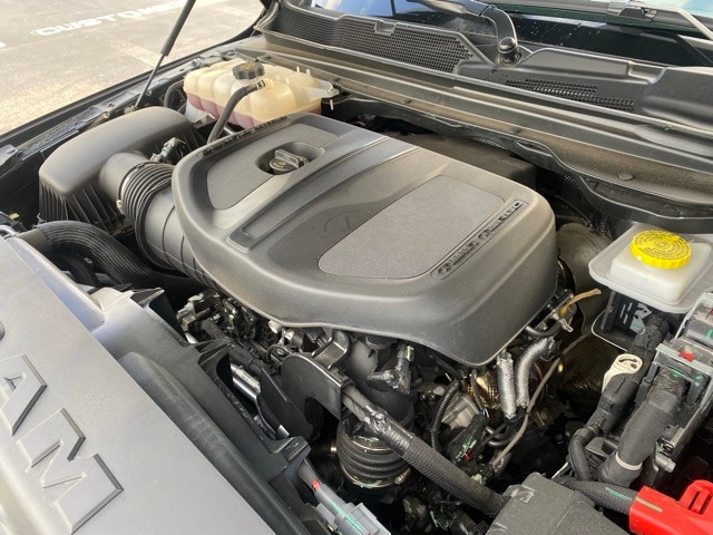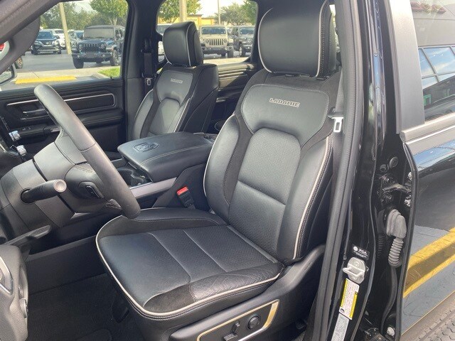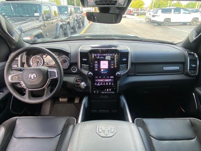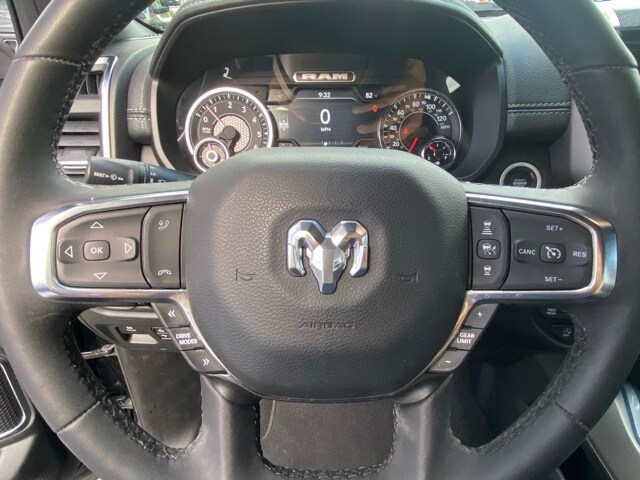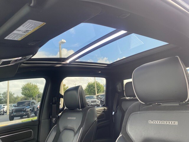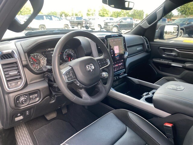 This 1500 is well equipped with Laramie Level 1 Equipment Group (Rain Sensitive Windshield Wipers and Remote Tailgate Release), Quick Order Package 21H Laramie, Sport Appearance Package (#1 Seat Foam Cushion, 3 Rear Seat Head Restraints, 4 Way Front Headrests, Accent Color Premium Power Mirrors, Auto Power-Folding Mirrors, Auto-Dimming Exterior Driver Mirror, Black Interior Accents, Black Painted Exterior Mirrors Caps, Body Color Front Bumper, Body Color Rear Bumper w/Step Pads, Bridgestone Brand Tires, Bucket Seats, Center Console Parts Module, Convex Wide-Angle Exterior Mirror Insert, Driver Seat Memory, Exterior Mirrors Courtesy Lamps, Exterior Mirrors w/Heating Element, Exterior Mirrors w/Memory, Exterior Mirrors w/Supplemental Signals, Front Seat Back Map Pockets, Full Length Upgraded Floor Console, Grille Surround 3 Body Color Tex 2 Black, Heated Front Seats, Heated Second Row Seats, Heated Steering Wheel, Leather Trimmed Bucket Seats, Power 2-Way Driver Lumbar Adjust, Power 2-Way Passenger Lumbar Adjust, Power Adjust 8-Way Driver Seat, Power Adjust 8-Way Front Passenger Seat, RAM Grille Badge - Chrome, Rear 60/40 Folding Split Recline Seat, Sport Performance Hood, and Ventilated Front Seats), 10 Speakers, 3.55 Rear Axle Ratio, 4-Wheel Disc Brakes, 4G LTE Wi-Fi Hot Spot, ABS brakes, Air Conditioning, Alloy wheels, AM/FM radio: SiriusXM with 360L, Apple CarPlay, Apple CarPlay/Android Auto, Audio memory, Auto High-beam Headlights, Auto-dimming door mirrors, Auto-dimming Rear-View mirror, Automatic temperature control, Brake assist, Bumpers: chrome, Chrome Exterior Mirrors, Compass, Connected Travel & Traffic Services, Connectivity - US/Canada, Delay-off headlights, Dome Dual LED Reading Lamp, Driver door bin, Driver vanity mirror, Dual front impact airbags, Dual front side impact airbags, Dual-Pane Panoramic Sunroof, Electronic Stability Control, Front anti-roll bar, Front Center Armrest w/Storage, Front dual zone A/C, Front fog lights, Front reading lights, Front wheel independent suspension, Fully automatic headlights, Garage door transmitter, Google Android Auto, GPS Antenna Input, GPS Navigation, HD Radio, Heated door mirrors, Heated front seats, Heated rear seats, Heated steering wheel, Illuminated entry, Integrated Voice Command w/Bluetooth, Leather steering wheel, Leather Trim 40/20/40 Bench Seat, LED Dome/Reading Lamp, Low tire pressure warning, Manufacturer's Statement of Origin, Memory seat, Navigation System, Occupant sensing airbag, Outside temperature display, Overhead airbag, Overhead console, Panic alarm, ParkView Rear Back-Up Camera, Passenger door bin, Passenger vanity mirror, Power door mirrors, Power driver seat, Power passenger seat, Power steering, Power windows, Radio data system, Radio: Uconnect 5 Nav w/12.0" Display, Rear anti-roll bar, Rear reading lights, Rear seat center armrest, Rear step bumper, Remote keyless entry, Security system, SiriusXM w/360L, Speed control, Split folding rear seat, Steering wheel mounted audio controls, Tachometer, Telescoping steering wheel, Tilt steering wheel, Traction control, Trailer Brake Control, Trip computer, Turn signal indicator mirrors, USB Host Flip, Variably intermittent wipers, Ventilated front seats, Voltmeter, and Wheels: 20" x 9" Premium Paint/Polish.