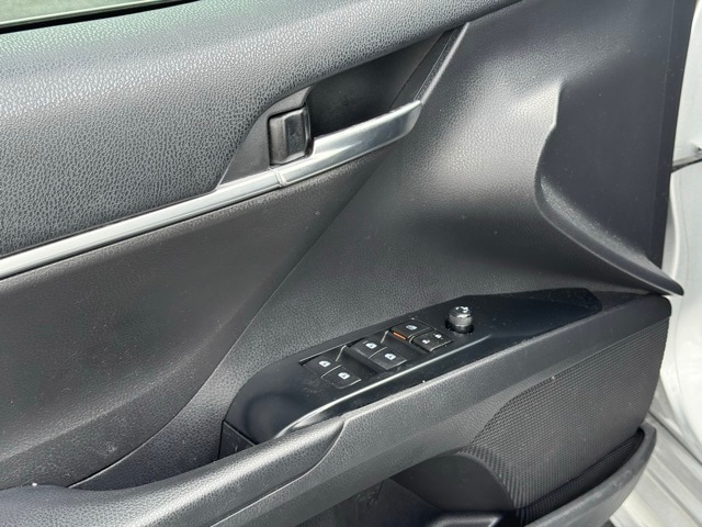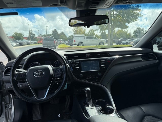 This Camry is well equipped with 4-Wheel Disc Brakes, 6 Speakers, ABS brakes, Air Conditioning, Alloy wheels, AM/FM radio: SiriusXM, Apple CarPlay/Android Auto, Auto High-beam Headlights, Automatic temperature control, Brake assist, Bumpers: body-color, Delay-off headlights, Driver door bin, Driver vanity mirror, Dual front impact airbags, Dual front side impact airbags, Electronic Stability Control, Emergency communication system: Safety Connect with 1-year trial, Exterior Parking Camera Rear, Fabric Seat Trim w/SofTex, Four wheel independent suspension, Front anti-roll bar, Front Bucket Seats, Front Center Armrest, Front reading lights, Front Sport Bucket Seats, Fully automatic headlights, Illuminated entry, Knee airbag, Leather Shift Knob, Low tire pressure warning, Occupant sensing airbag, Outside temperature display, Overhead airbag, Overhead console, Panic alarm, Passenger door bin, Passenger vanity mirror, Power door mirrors, Power driver seat, Power steering, Power windows, Radio data system, Radio: AM/FM Audio System, Rear anti-roll bar, Rear reading lights, Rear seat center armrest, Rear side impact airbag, Rear window defroster, Remote keyless entry, Security system, Speed control, Speed-sensing steering, Split folding rear seat, Spoiler, Sport steering wheel, Steering wheel mounted audio controls, Tachometer, Telescoping steering wheel, Tilt steering wheel, Traction control, Trip computer, Variably intermittent wipers, and Wheels: 8.0J x 18" Black Machined-Finish Alloy.