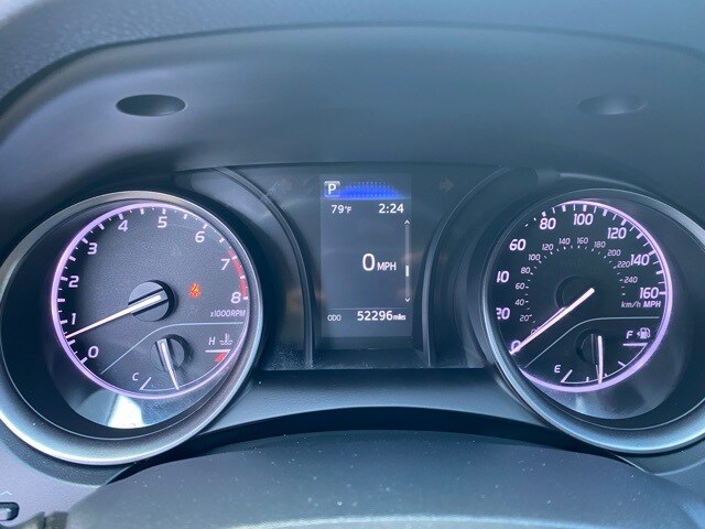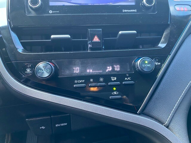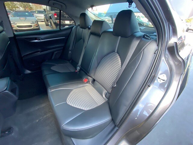 This Camry is well equipped with 4-Wheel Disc Brakes, 6 Speakers, 8.0J x 18" Alloy Wheels, ABS brakes, Air Conditioning, Alloy wheels, AM/FM radio: SiriusXM, Apple CarPlay/Android Auto, Auto High-beam Headlights, Automatic temperature control, Brake assist, Bumpers: body-color, Delay-off headlights, Driver door bin, Driver vanity mirror, Dual front impact airbags, Dual front side impact airbags, Electronic Stability Control, Emergency communication system: Safety Connect (1-year trial), Exterior Parking Camera Rear, Four wheel independent suspension, Front anti-roll bar, Front Bucket Seats, Front Center Armrest, Front dual zone A/C, Front reading lights, Fully automatic headlights, Heated door mirrors, Illuminated entry, Knee airbag, Leather steering wheel, Low tire pressure warning, Occupant sensing airbag, Outside temperature display, Overhead airbag, Overhead console, Panic alarm, Passenger door bin, Passenger vanity mirror, Power door mirrors, Power driver seat, Power steering, Power windows, Radio data system, Radio: Audio, Rear anti-roll bar, Rear seat center armrest, Rear side impact airbag, Rear window defroster, Remote keyless entry, Security system, Speed control, Speed-sensing steering, Split folding rear seat, Spoiler, Sport SofTex Seat Trim w/Fabric Inserts, Steering wheel mounted audio controls, Tachometer, Telescoping steering wheel, Tilt steering wheel, Traction control, Trip computer, Turn signal indicator mirrors, and Variably intermittent wipers.