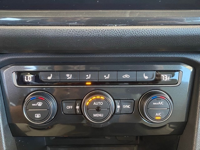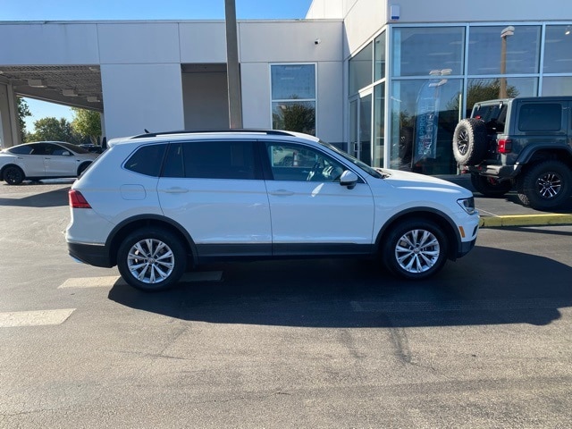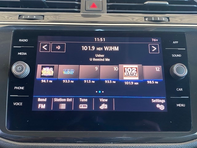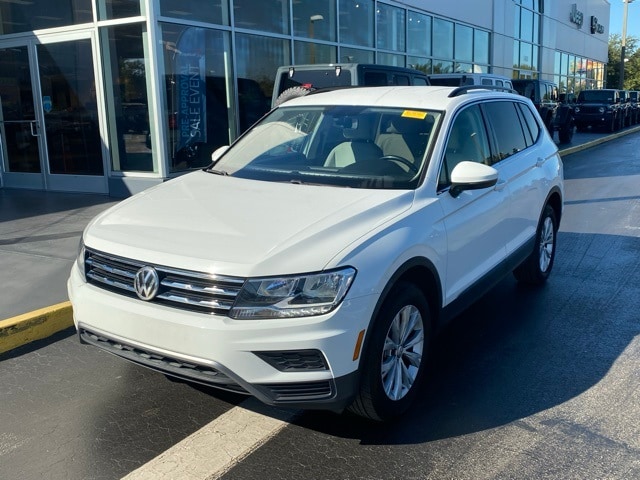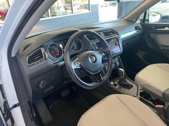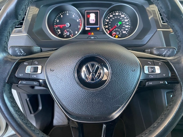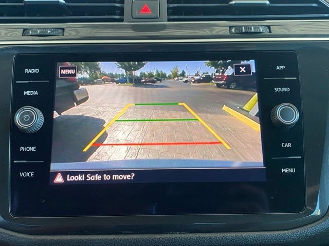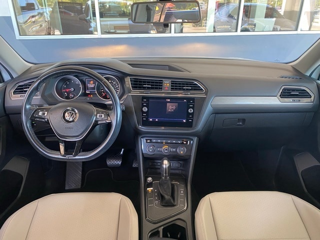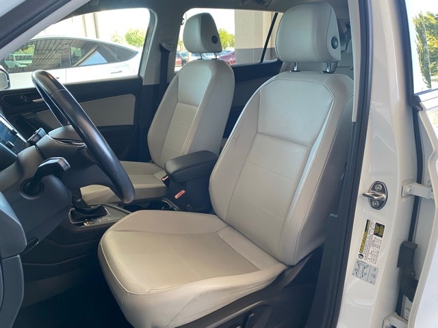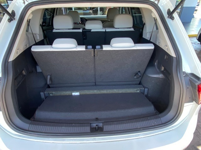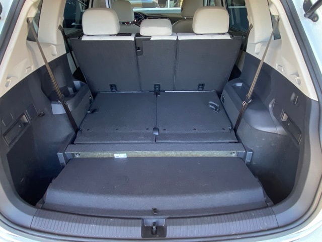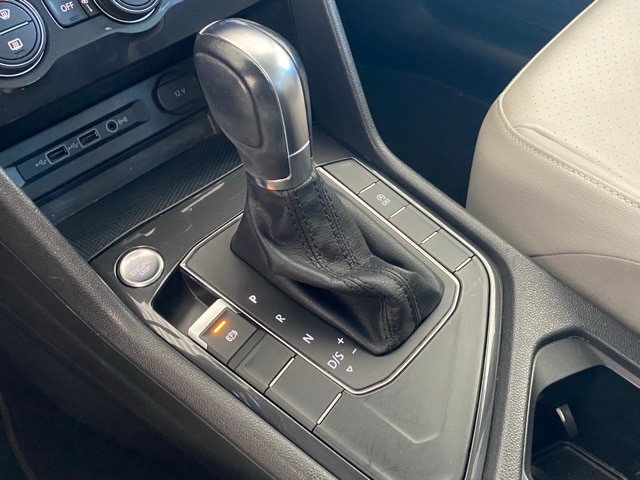 This Tiguan is well equipped with 3.33 Axle Ratio, 3rd row seats: bench, 4-Wheel Disc Brakes, 6 Speakers, ABS brakes, Air Conditioning, Alloy wheels, AM/FM radio: SiriusXM, Automatic temperature control, Brake assist, Bumpers: body-color, Compass, Delay-off headlights, Driver door bin, Driver vanity mirror, Dual front impact airbags, Dual front side impact airbags, Electronic Stability Control, Emergency communication system: VW Car-Net, Exterior Parking Camera Rear, Four wheel independent suspension, Front anti-roll bar, Front Bucket Seats, Front Center Armrest, Front dual zone A/C, Front fog lights, Front reading lights, Fully automatic headlights, Heated door mirrors, Heated Front Bucket Seats, Heated front seats, Illuminated entry, Leather Shift Knob, Low tire pressure warning, Navigation System, Occupant sensing airbag, Outside temperature display, Overhead airbag, Overhead console, Panic alarm, Passenger door bin, Passenger vanity mirror, Perforated V-Tex Leatherette Seating Surfaces, Power door mirrors, Power driver seat, Power Liftgate, Power moonroof, Power steering, Power windows, Radio data system, Radio: AM/FM/HD/CD w/Dual USB Inputs, Rear anti-roll bar, Rear reading lights, Rear seat center armrest, Rear window defroster, Rear window wiper, Remote CD player, Remote keyless entry, Roof rack: rails only, Security system, Speed control, Speed-sensing steering, Split folding rear seat, Spoiler, Steering wheel mounted audio controls, Tachometer, Telescoping steering wheel, Tilt steering wheel, Traction control, Trip computer, Turn signal indicator mirrors, Variably intermittent wipers, and Wheels: 18" Nizza.