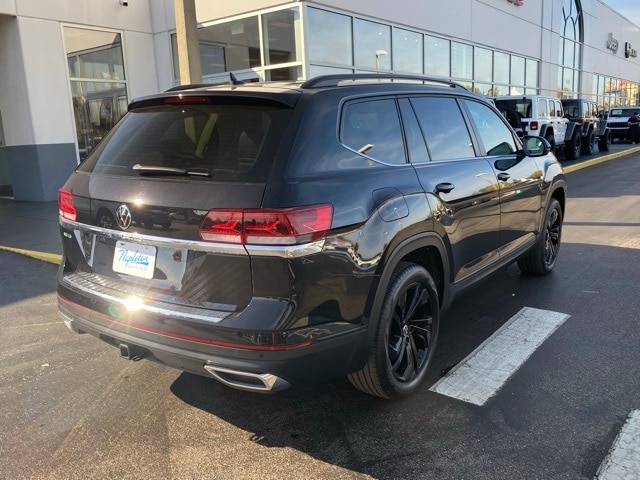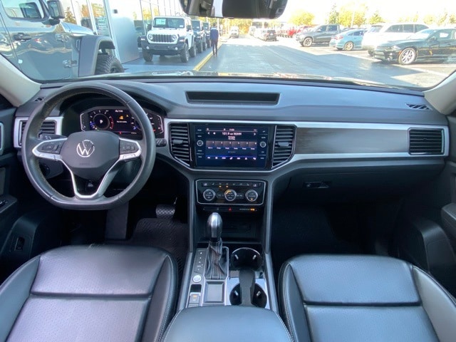 This Atlas is well equipped with 3.60 Axle Ratio, 3rd row seats: split-bench, 4-Wheel Disc Brakes, 6 Speakers, ABS brakes, Air Conditioning, Alloy wheels, AM/FM radio: SiriusXM with 360L, Auto-dimming Rear-View mirror, Automatic temperature control, Brake assist, Bumpers: body-color, Compass, Delay-off headlights, Driver door bin, Driver vanity mirror, Dual front impact airbags, Dual front side impact airbags, Electronic Stability Control, Emergency communication system, Exterior Parking Camera Rear, Four wheel independent suspension, Front anti-roll bar, Front Bucket Seats, Front Center Armrest, Front dual zone A/C, Front fog lights, Front reading lights, Fully automatic headlights, Heated Comfort Front Bucket Seats, Heated door mirrors, Heated front seats, Illuminated entry, Leather Shift Knob, Low tire pressure warning, Occupant sensing airbag, Outside temperature display, Overhead airbag, Overhead console, Panic alarm, Passenger door bin, Passenger vanity mirror, Perforated V-Tex Leatherette Seating Surfaces, Power door mirrors, Power driver seat, Power Liftgate, Power steering, Power windows, Radio data system, Radio: MIB3 Composition Media w/8" Touchscreen, Rain sensing wipers, Rear air conditioning, Rear anti-roll bar, Rear reading lights, Rear seat center armrest, Rear window defroster, Rear window wiper, Remote keyless entry, Roof rack: rails only, Security system, Speed control, Speed-sensing steering, Split folding rear seat, Spoiler, Standard Suspension, Steering wheel mounted audio controls, Tachometer, Telescoping steering wheel, Tilt steering wheel, Traction control, Trip computer, Turn signal indicator mirrors, Variably intermittent wipers, and Wheels: 20" x 8J 5-Spoke Silver Painted Alloy.