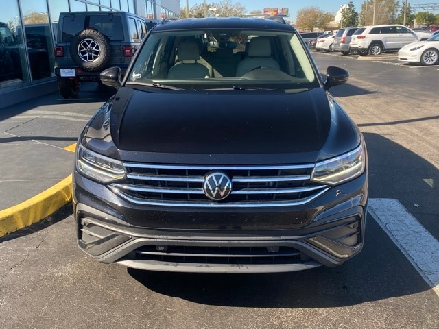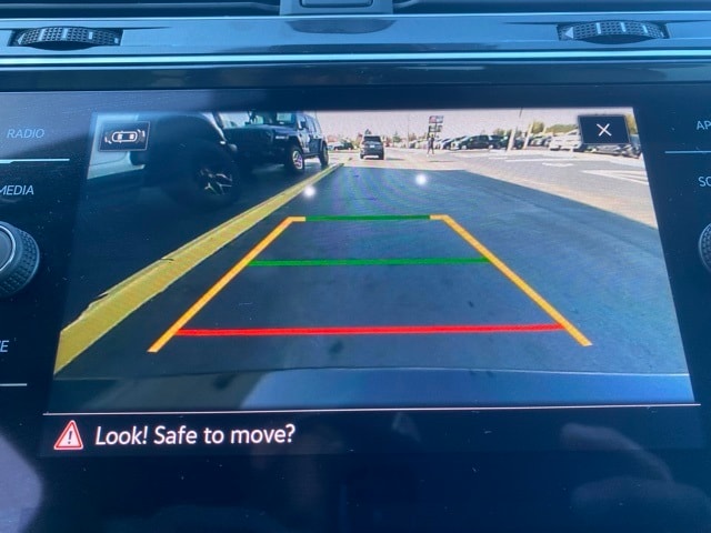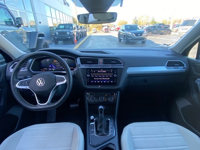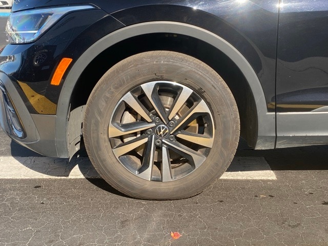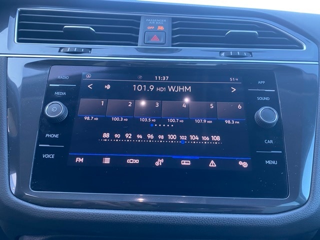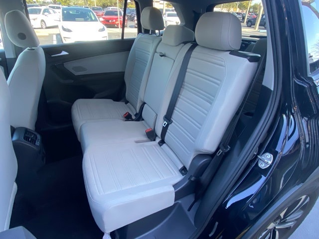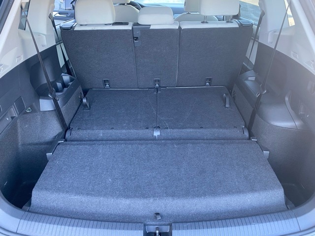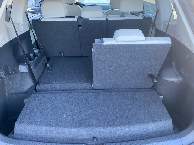 This Tiguan is well equipped with 3.33 Axle Ratio, 3rd row seats: bench, 4-Wheel Disc Brakes, 4-Wheel Independent Suspension, 6 Speakers, ABS brakes, Air Conditioning, Alloy wheels, AM/FM radio, Brake assist, Bumpers: body-color, Cloth Seating Surfaces, Compass, Delay-off headlights, Driver door bin, Driver vanity mirror, Dual front impact airbags, Dual front side impact airbags, Electronic Stability Control, Emergency communication system: VW Car-Net Safe & Secure 5-year, Exterior Parking Camera Rear, Four wheel independent suspension, Front anti-roll bar, Front Bucket Seats, Front Center Armrest, Front reading lights, Fully automatic headlights, Heated door mirrors, Heated Front Seats, Heated front seats, Illuminated entry, Leather Shift Knob, Low tire pressure warning, Occupant sensing airbag, Outside temperature display, Overhead airbag, Overhead console, Panic alarm, Passenger door bin, Passenger vanity mirror, Power door mirrors, Power steering, Power windows, Radio data system, Rain sensing wipers, Rear anti-roll bar, Rear reading lights, Rear seat center armrest, Rear window defroster, Rear window wiper, Remote keyless entry, Speed control, Speed-sensing steering, Split folding rear seat, Spoiler, Steering wheel mounted audio controls, Tachometer, Telescoping steering wheel, Tilt steering wheel, Traction control, Trip computer, Turn signal indicator mirrors, Variably intermittent wipers, and Wheels: 17" 2-Tone Machined Twin 5-Spoke Alloy.